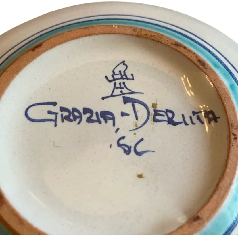 3.5” x 1.75” beautifully decorated in yellow, blue and brown. Signed Grazia- Deruta SC on bottom