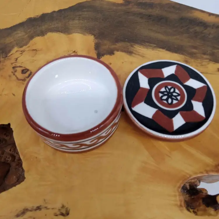 Here's a cute little trinket box. It's ceramic and done in black, brown and white. It's hand painted and measures 2 3/16 inches in diameter and 1 5/16 inches tall. No chips or cracks.