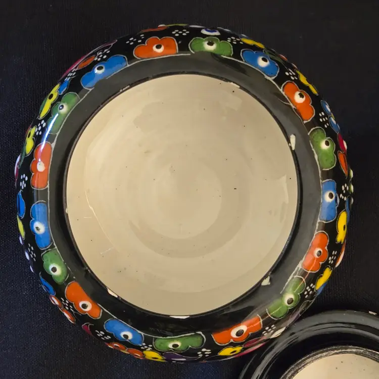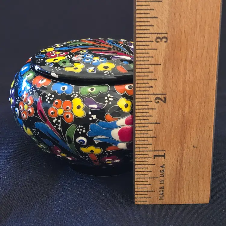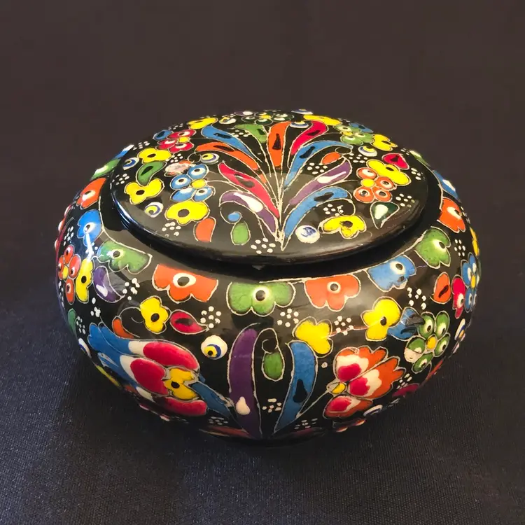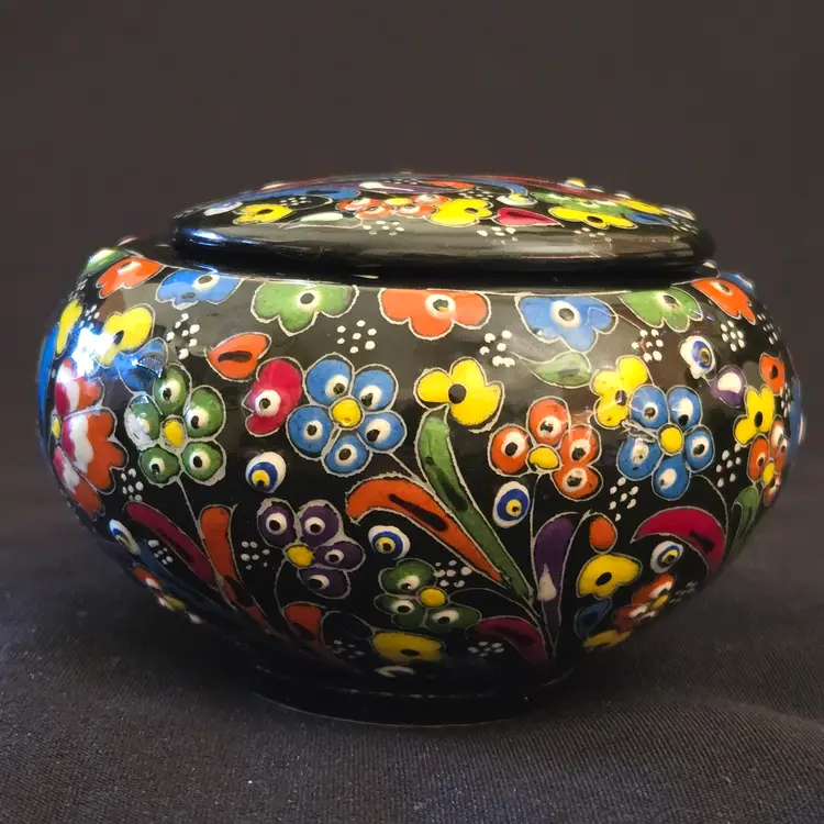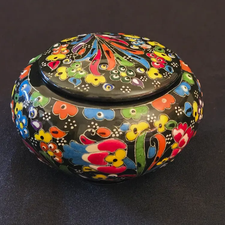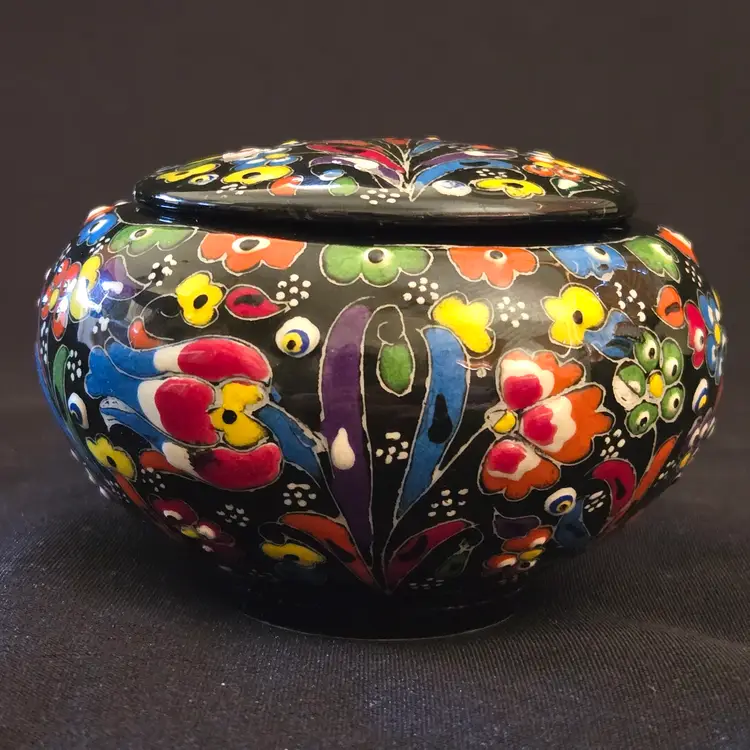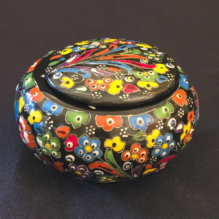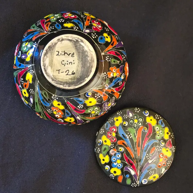Signed Ceramic Trinket Box Turkish Colorful Glazed Hand Painted Lidded Round Decorative. Used condition with loose fitting lid, flakes of color missing both on the lid and the body, dirty. Please view all the photos and please ask any questions prior to purchase when possible.