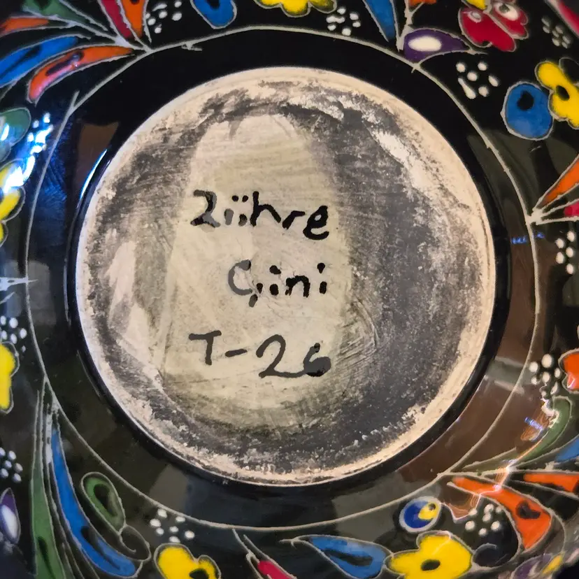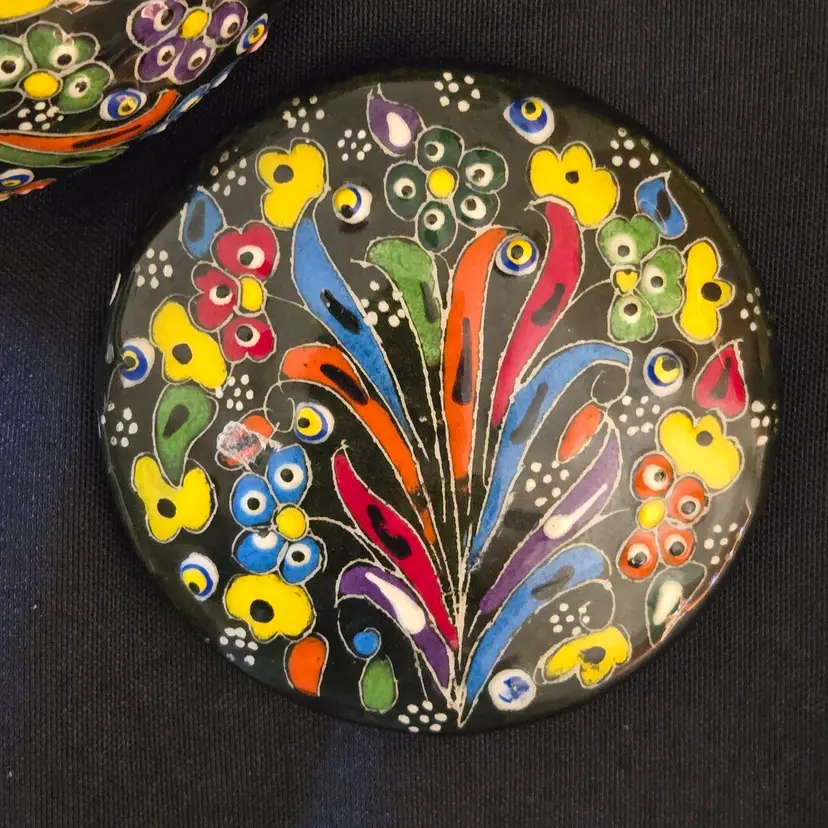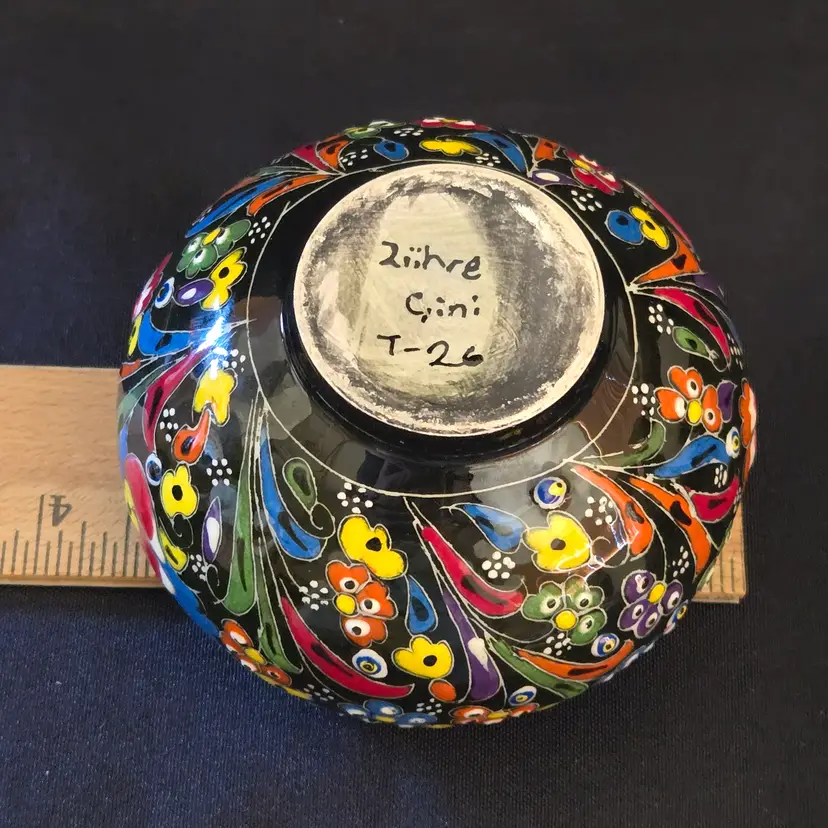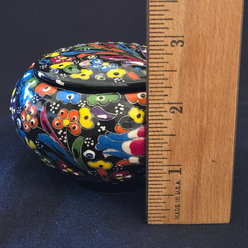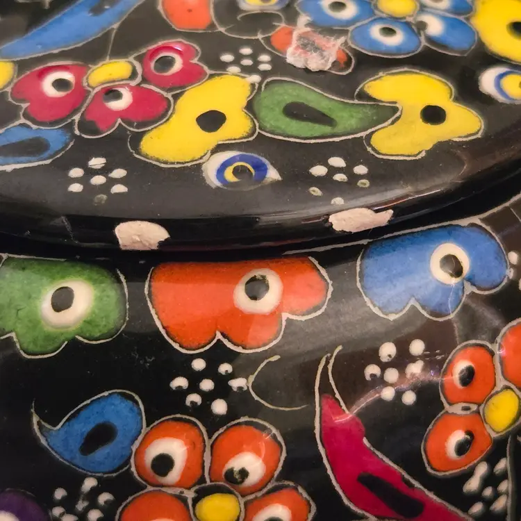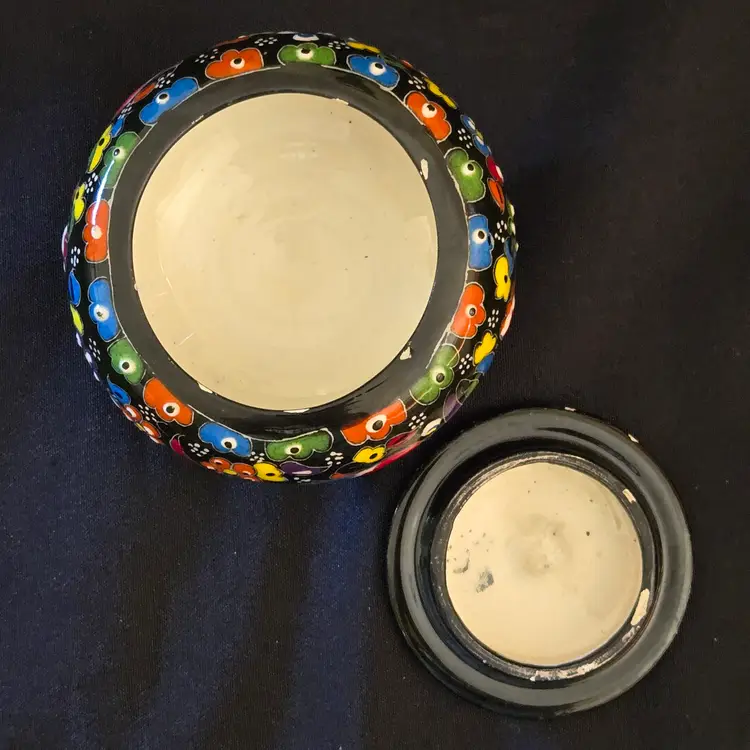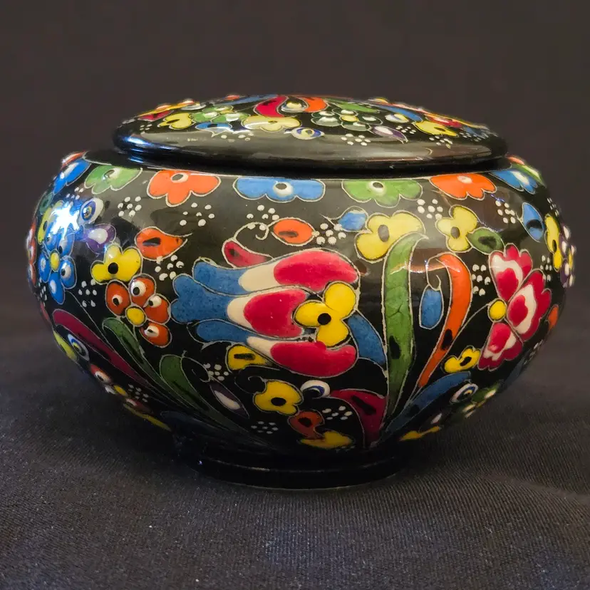 Signed Ceramic Trinket Box Turkish Colorful Glazed Hand Painted Lidded Round Decorative. Used condition with loose fitting lid, flakes of color missing both on the lid and the body, dirty. Please view all the photos and please ask any questions prior to purchase when possible.