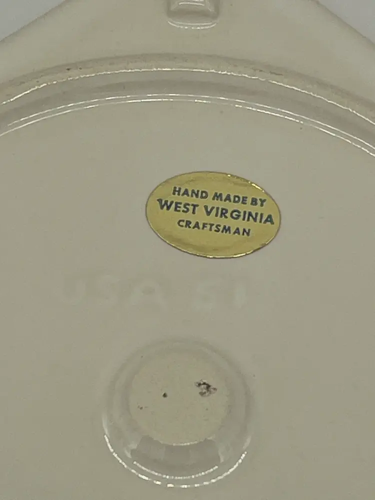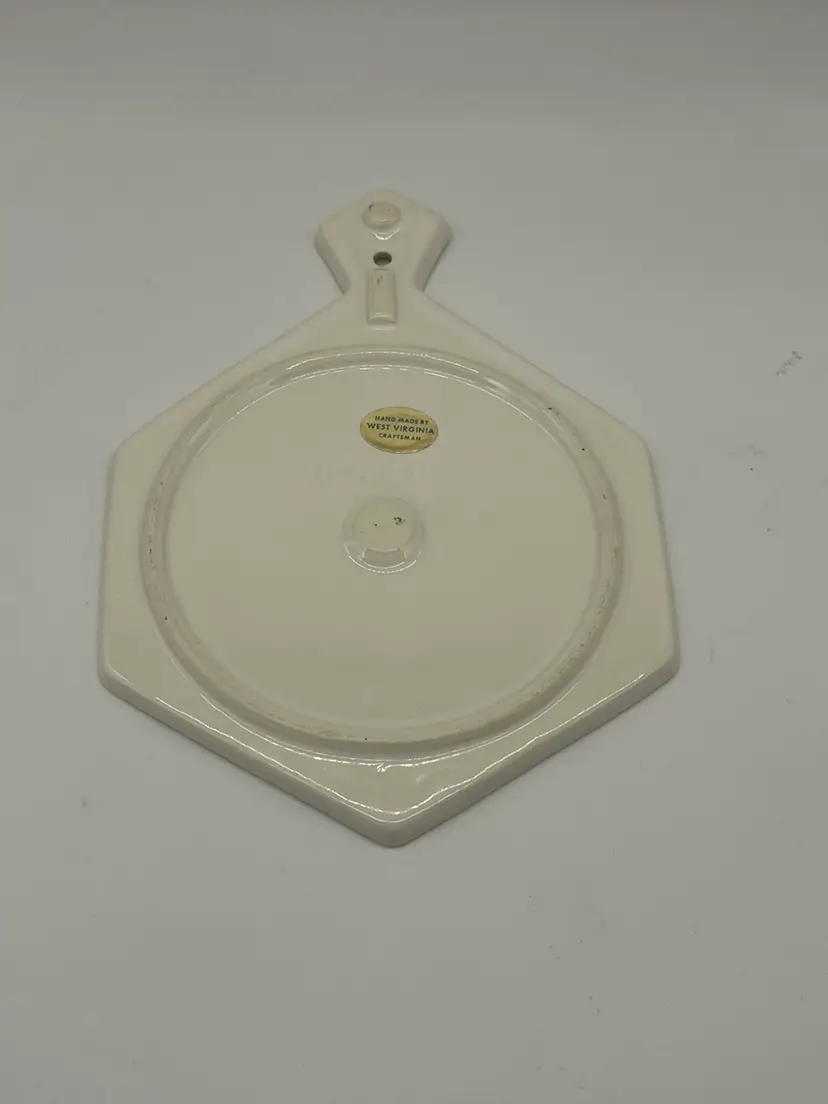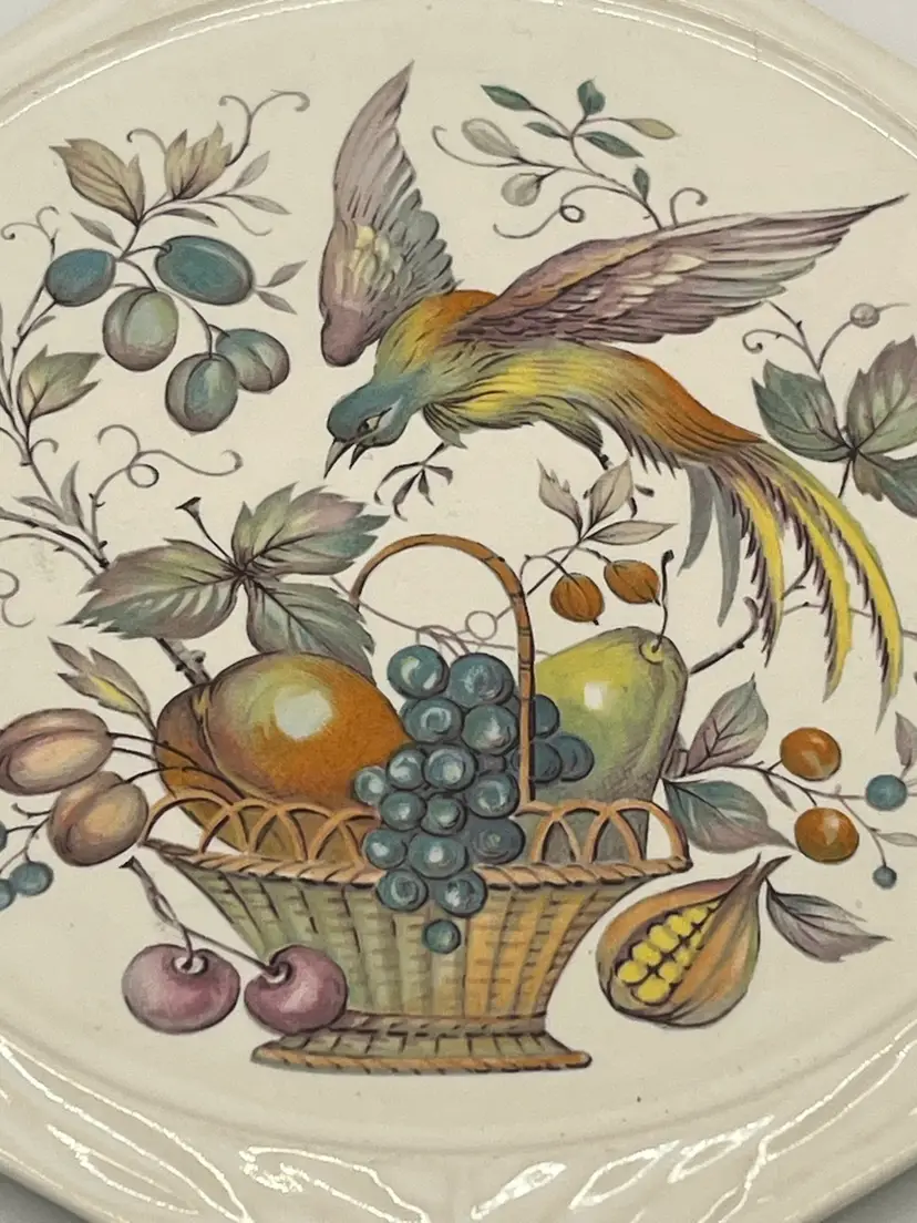 This is a West Virginia Craftsman trivet/wall hanging. He imprint on back says US 51 and has a sticker. The theme is a bird and fruit basket.