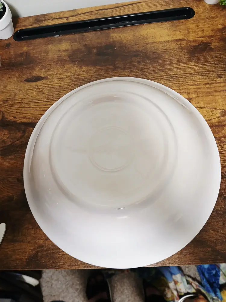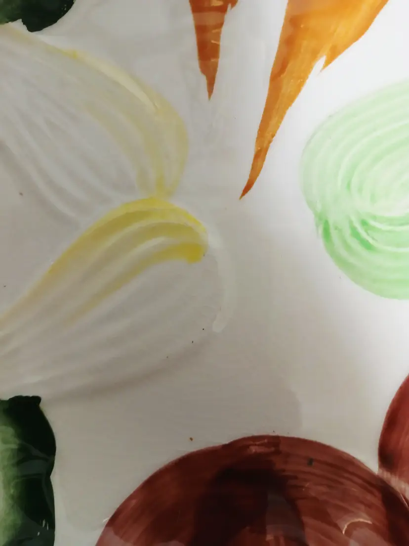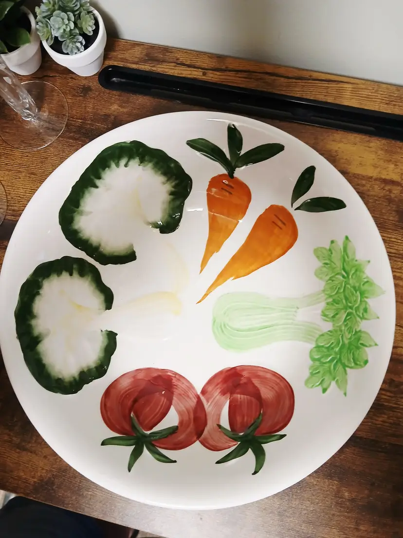 Serve up style with this hand-painted platter featuring vibrant veggies. Perfect for entertaining or as a decorative kitchen piece. Approximately 12 inches in diameter. HAS Crazing