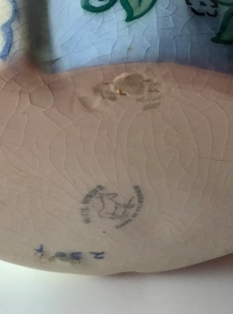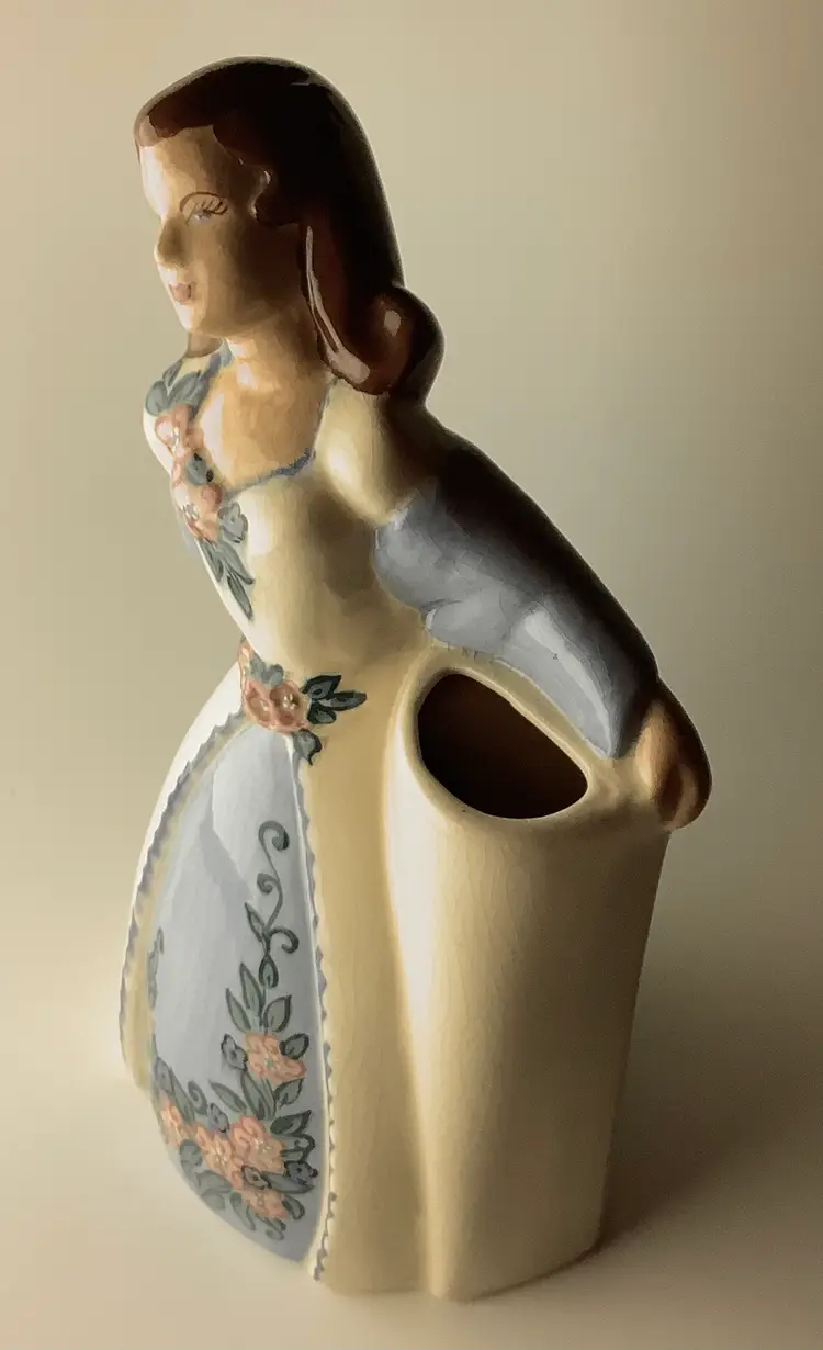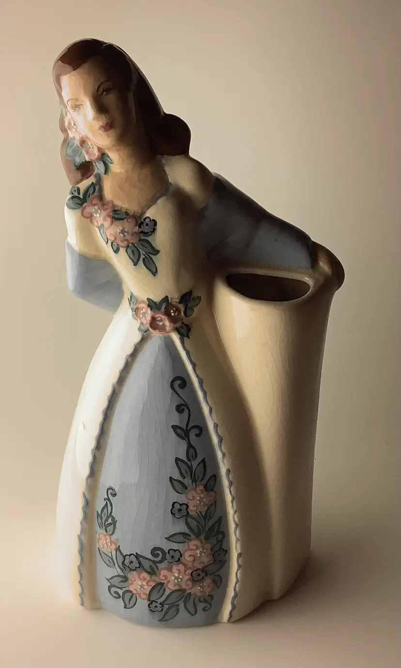 Vintage bud vase planter measures 10.25” x 5.25”. Brand underpainted on bottom of base see photo. Good condition. California pottery. Minor crazing from age and normal wear. Lovely ecru and blue floral design. I appreciate your interest! I ship 3 day UPS. Bubble wrapped for careful shipping. Thanks!