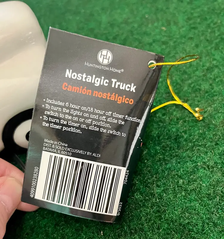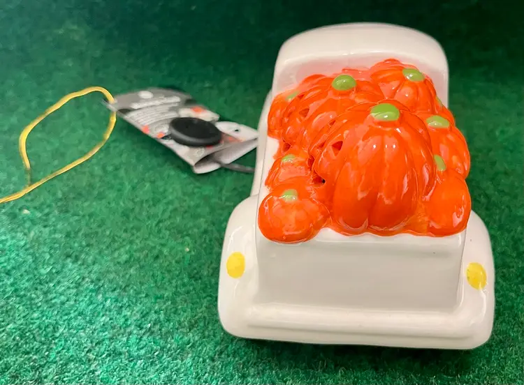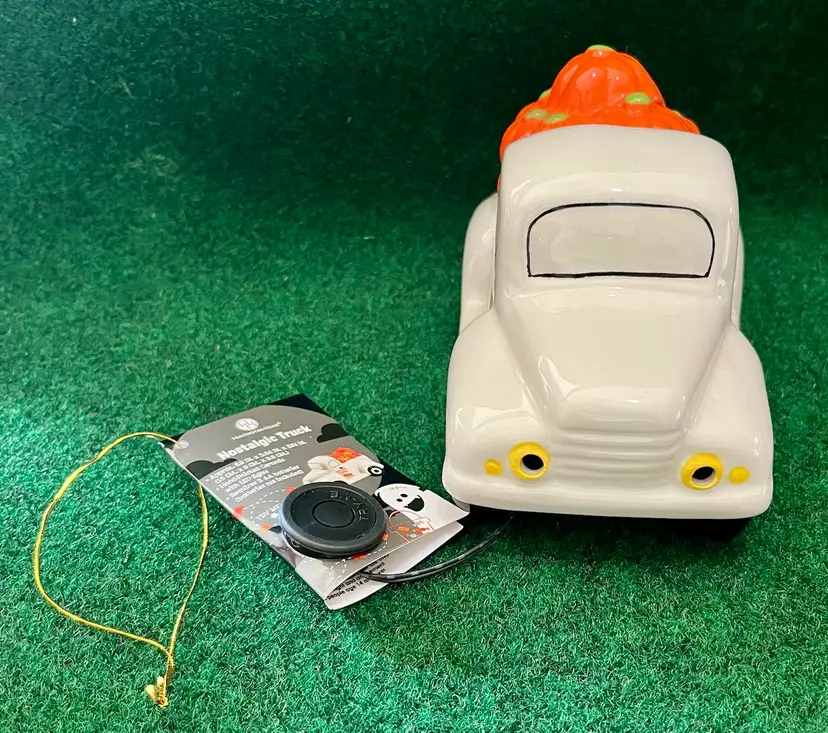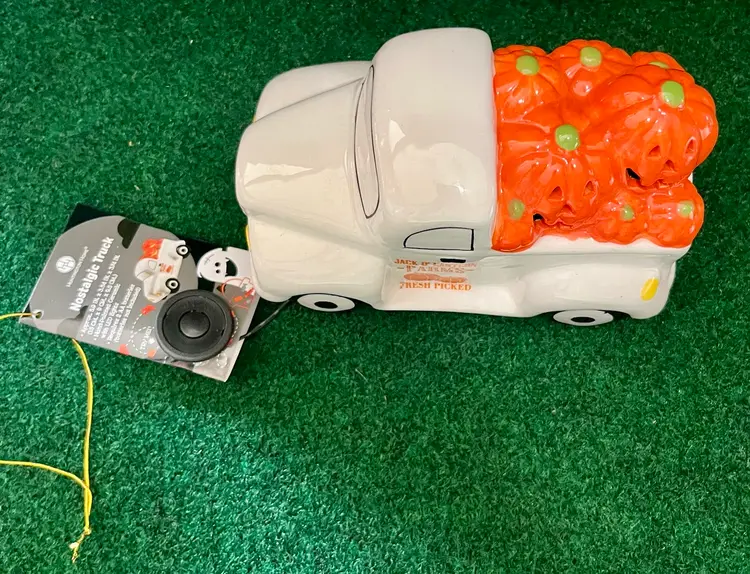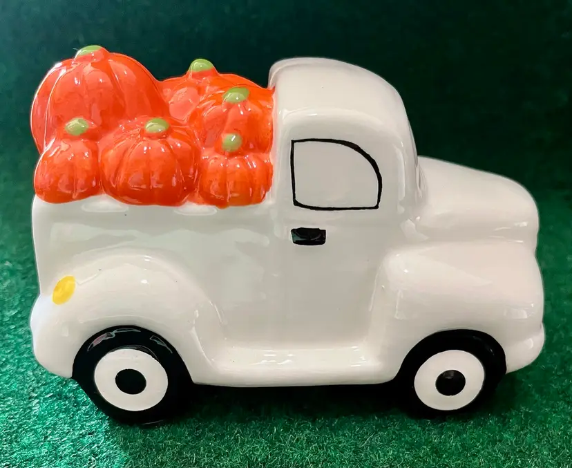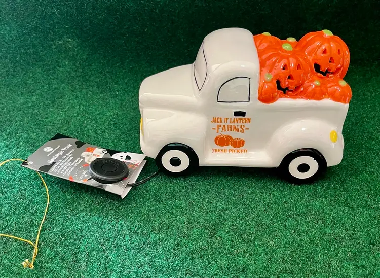 Originally featured at Aldi’s Grocery Stores, this Huntington Home Nostalgic piece adds a touch of charm to your Thanksgiving, fall harvest, or Halloween decor with this adorable ceramic vintage farm white truck. The truck features grinning orange pumpkins in its back “Jack O Lantern Farms Fresh Picked” on its side door and is perfect for adding a festive touch to any space. The truck is made in China and is not handmade.