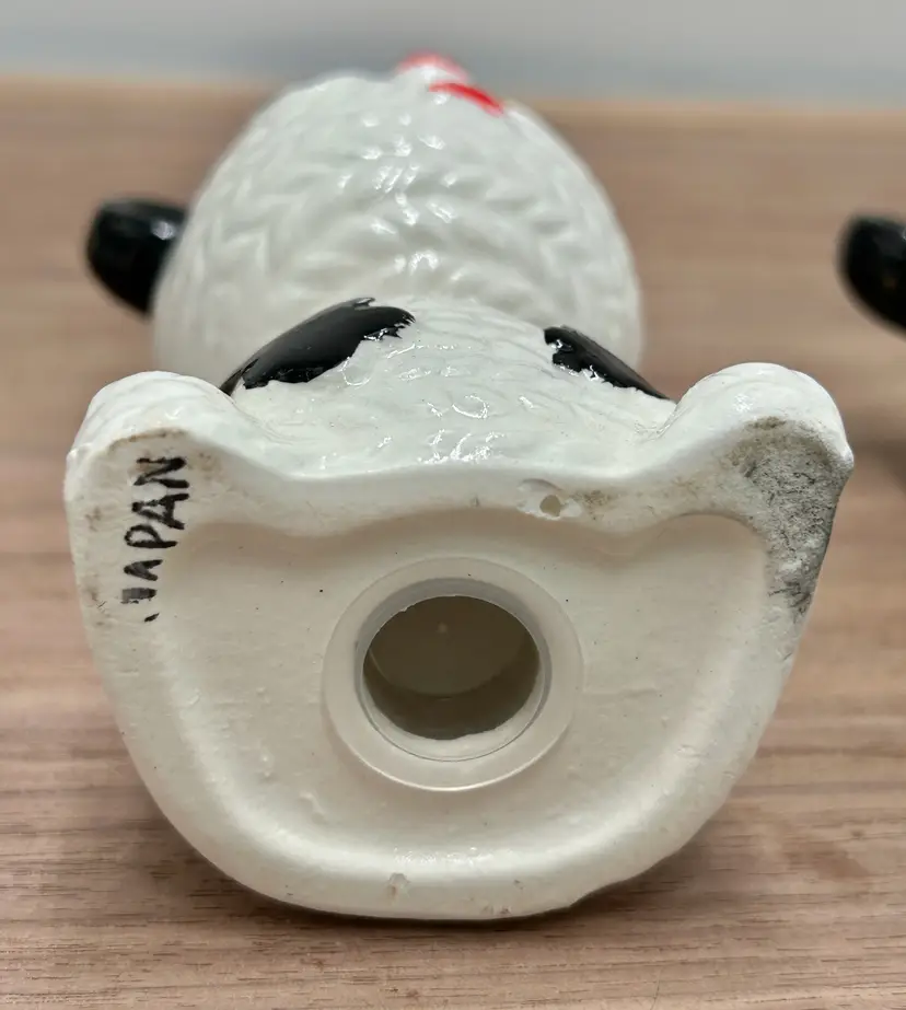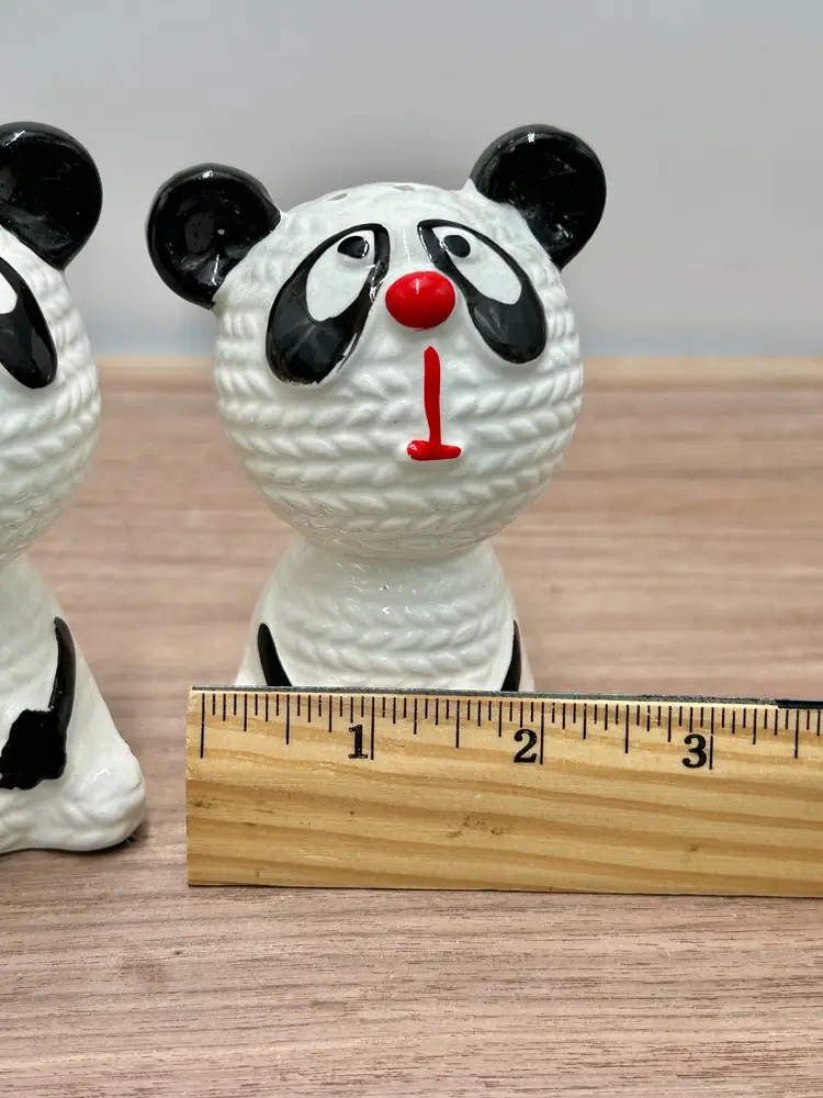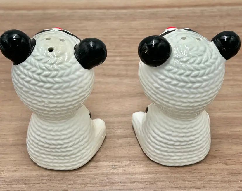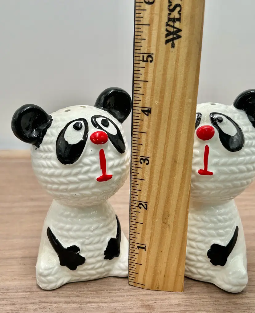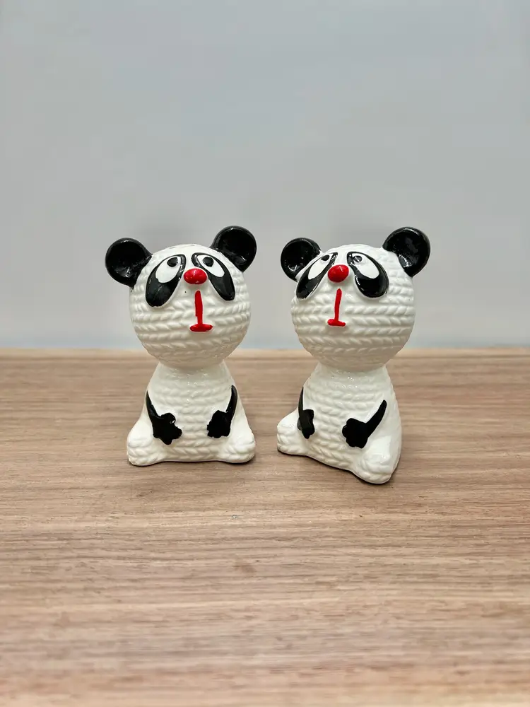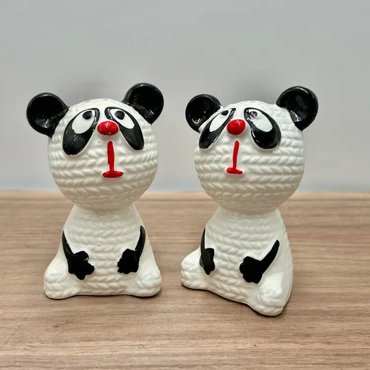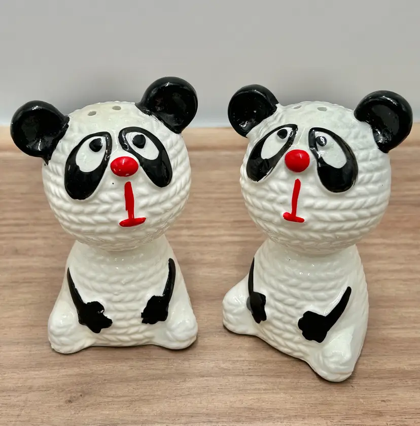 How cute are these guys and the best part is they are new old stock!! We were lucky enough to find a shop who had found all of these fun vintage 70’s pieces in an old warehouse. These two shakers were so fun we had to grab them. These panda bears are made in Japan and look as if they are made of yarn. Each shaker is about 4 ¼ inches tall and about 2 inches wide. The best part about them hiding for 50 years is that they are in great condition with no chips or cracks and both still have their stoppers.