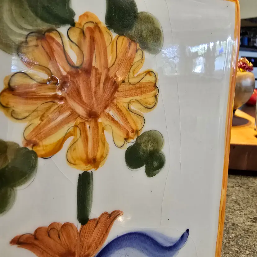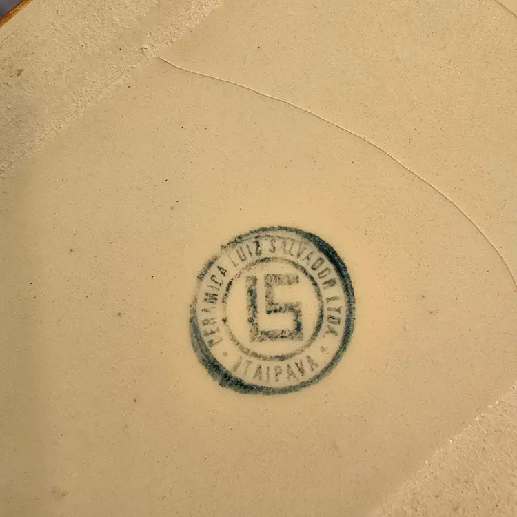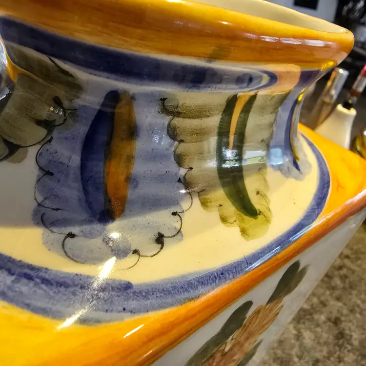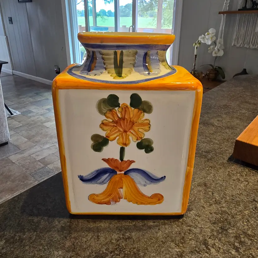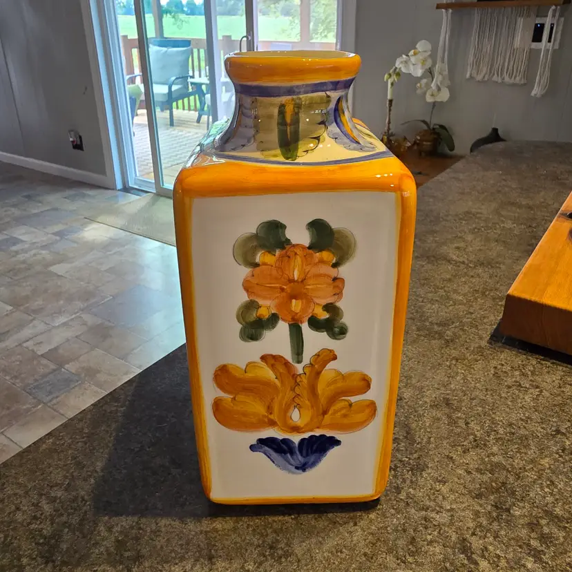 Beautiful vase by Cerâmica Luiz Salvador Ltda. Brazilian made. 7"x4"x10" No chips. The finished ceramic has a subtle cracked look to it (intended). Hand painted. Gorgeous blue, green, yellow, orange, and white.