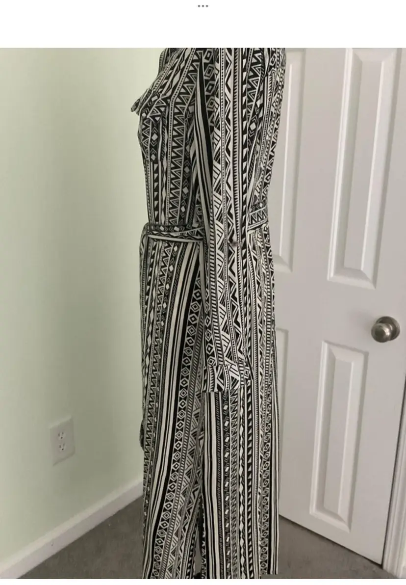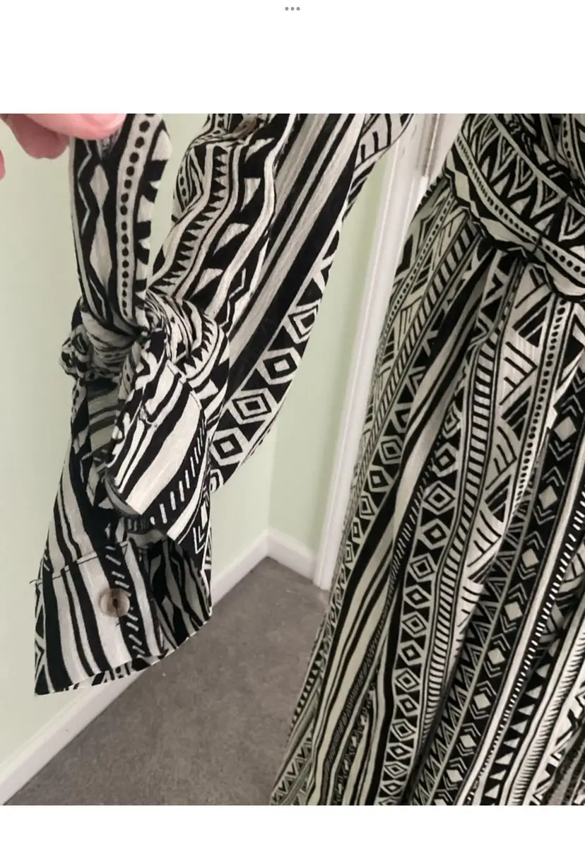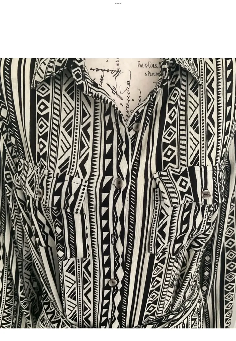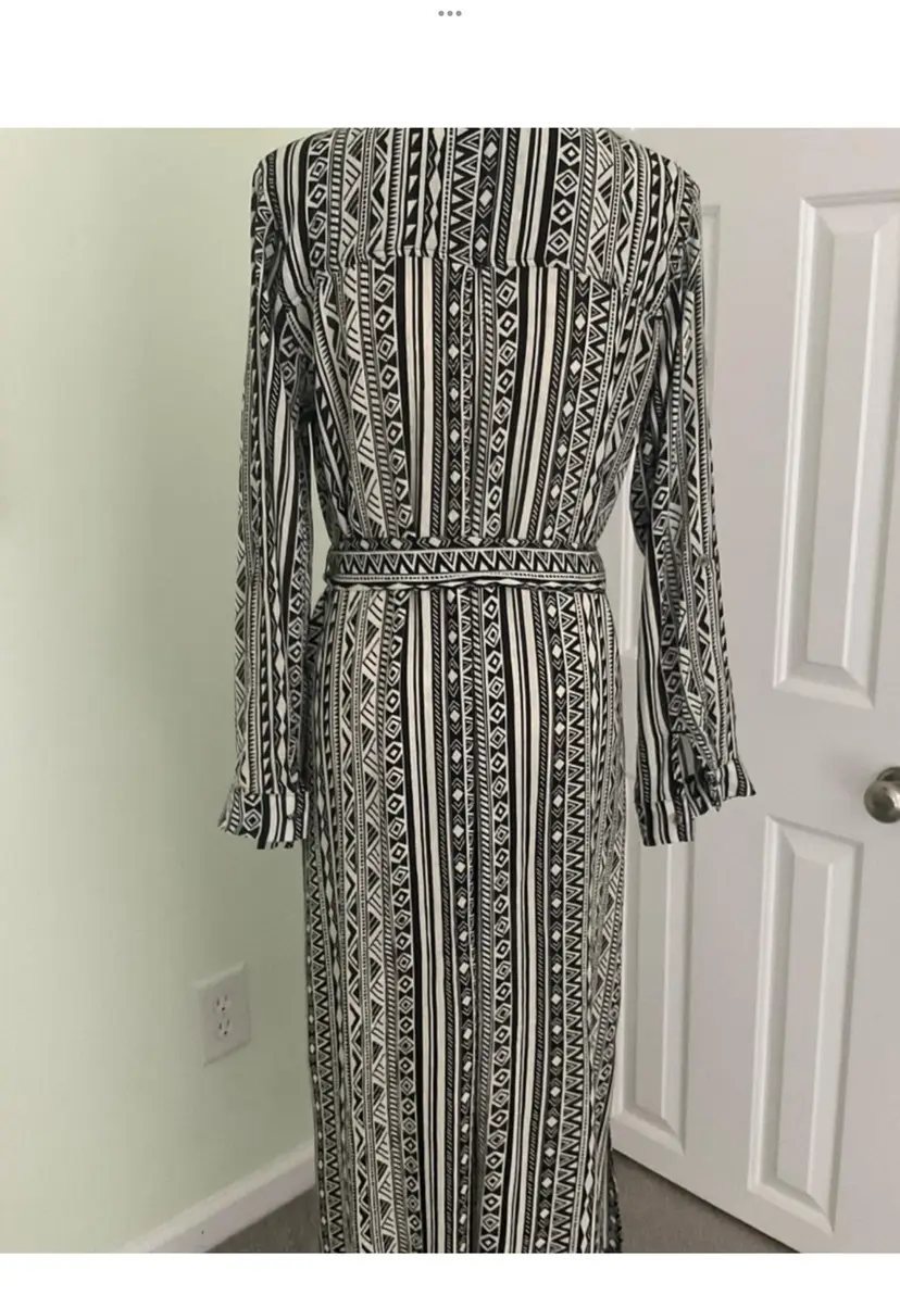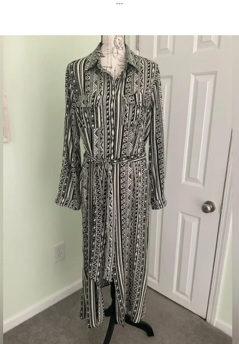 Ces Femme long dress that is a full button front with a tie belt if you want to use it. Also has breast pockets. This is long sleeves that will roll up and button tab. This is a white and black print.