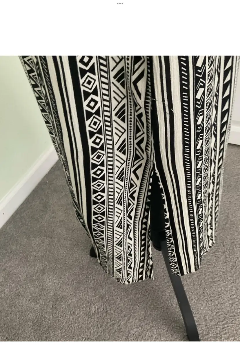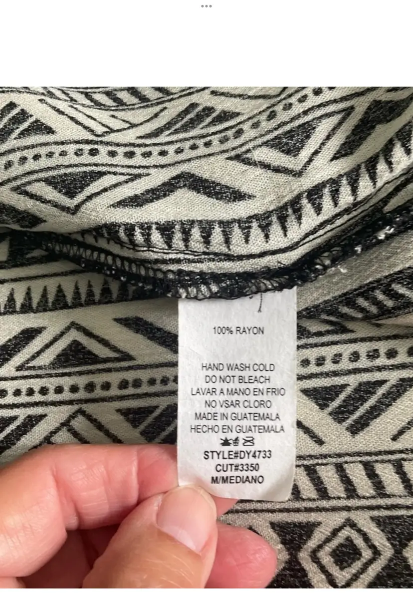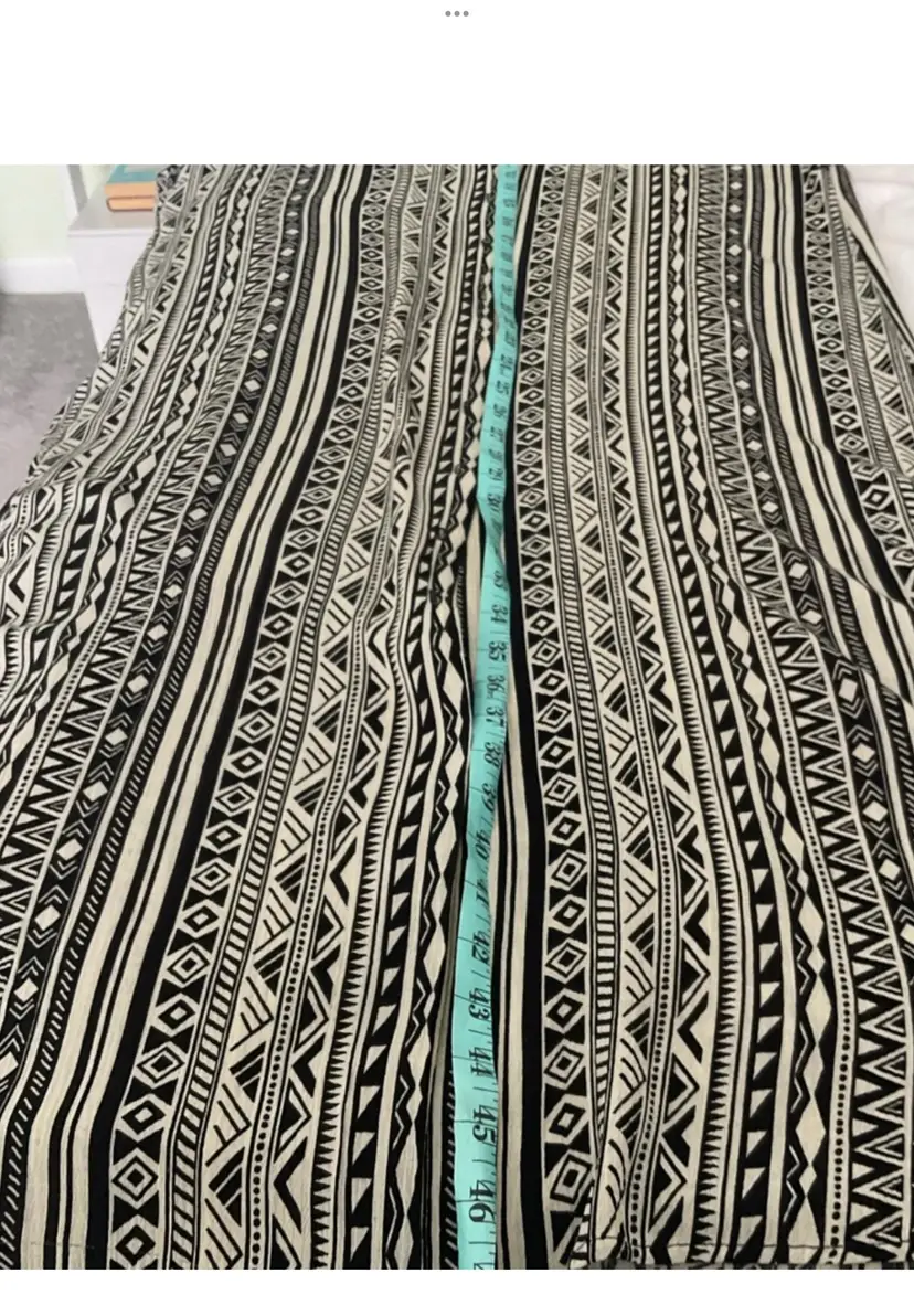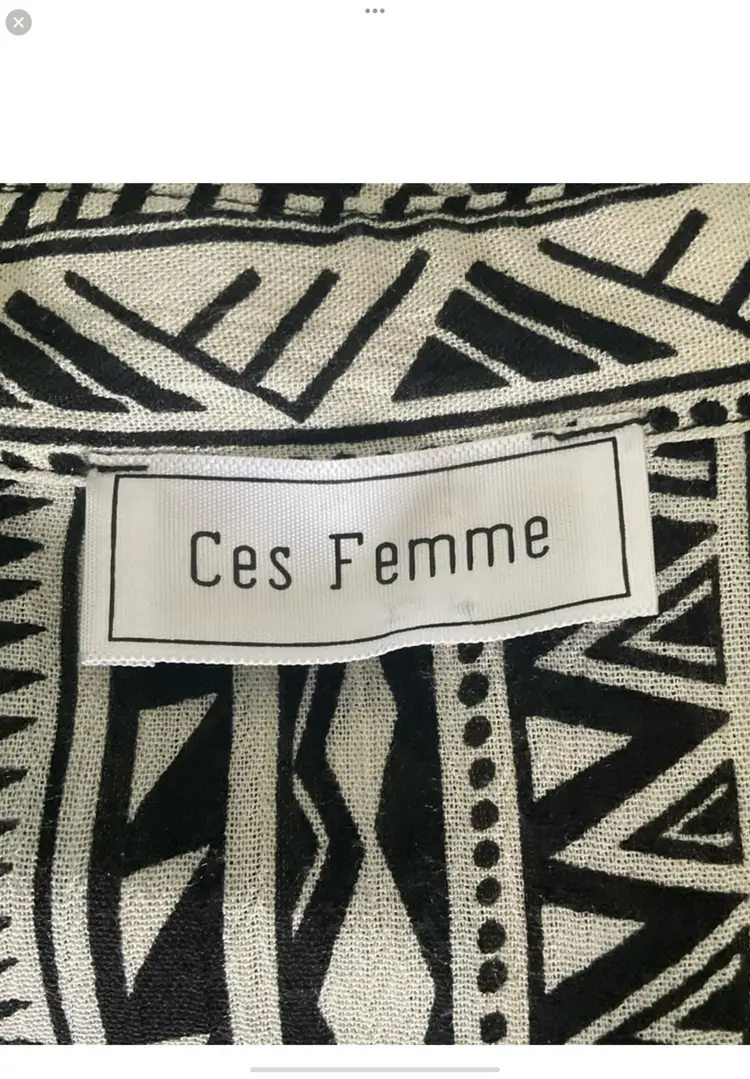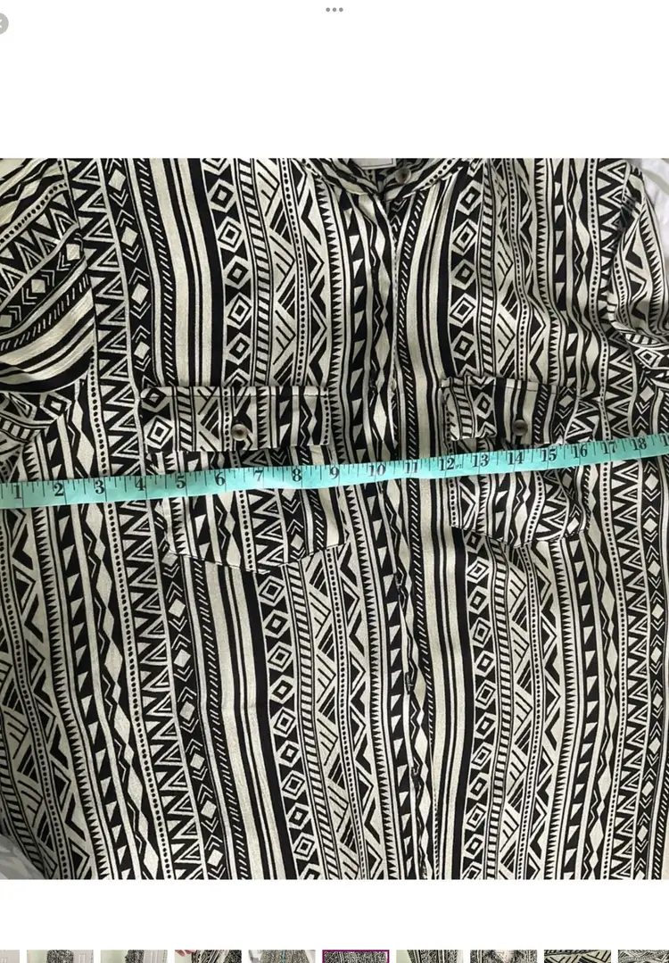 Ces Femme long dress that is a full button front with a tie belt if you want to use it. Also has breast pockets. This is long sleeves that will roll up and button tab. This is a white and black print.