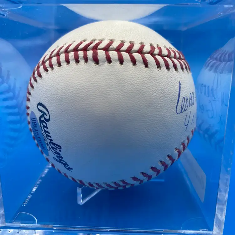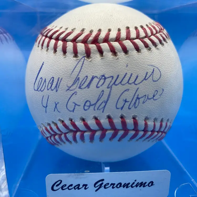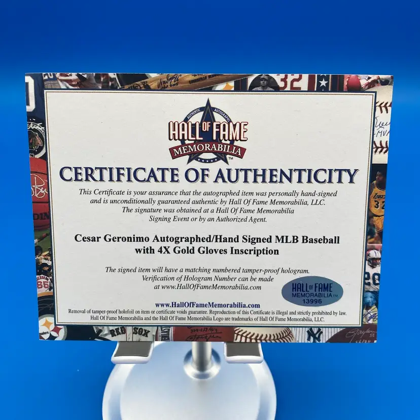 You are purchasing one Cesar Geronimo '4x Gold Gloves' Signed Rawlings Official Major League Baseball. This Listing includes one hard plastic display case, one certificate of authenticity w/ sticker by Hall of Fame Memorabilia, and one MAB Celebrity Services authentication sticker. This Ball is in great overall condition. See images for a closer look at each angle. No chips or cracks in the case. No rips on the certificate.