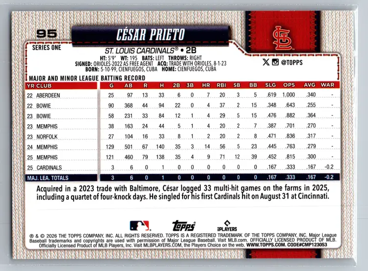 Cesar Prieto 2026 Topps Series 1 Rainbow Foil Parallel #85 Cardinals