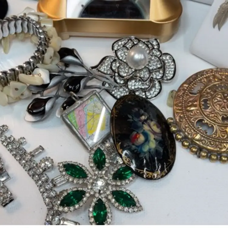 Welcome to our shop of mostly pre-owned and sometimes new jewelry treasures, trinket boxes, compacts - sometimes art and glass. Please follow us so you're in the know when we go live or add new items. Our curated beauties include a large selection of vintage pieces as well as many contemporary items. We also craft and design our own fun costume (and some fine) jewelry pieces, bookmarks, digital art and more in our small studio.