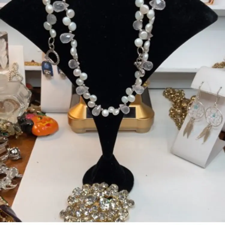 Welcome to our shop of mostly pre-owned and sometimes new jewelry treasures, trinket boxes, compacts - sometimes art and glass. Please follow us so you're in the know when we go live or add new items. Our curated beauties include a large selection of vintage pieces as well as many contemporary items. We also craft and design our own fun costume (and some fine) jewelry pieces, bookmarks, digital art and more in our small studio.