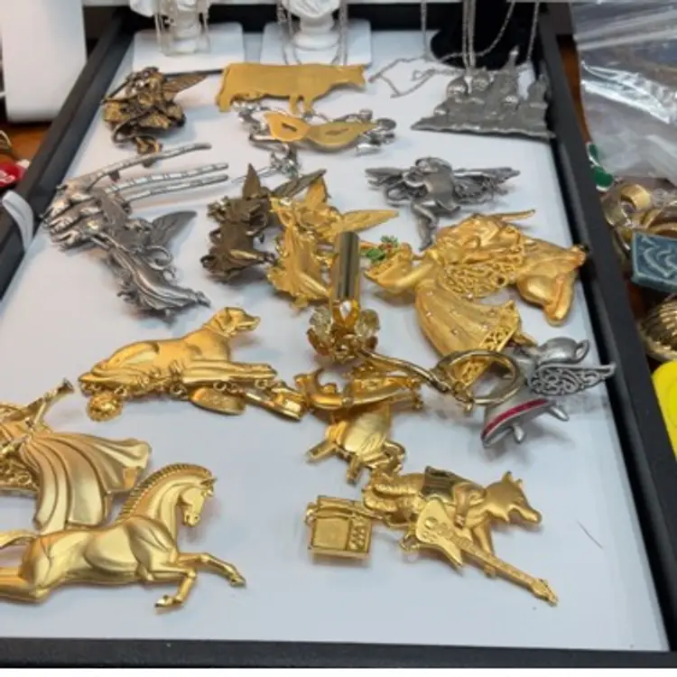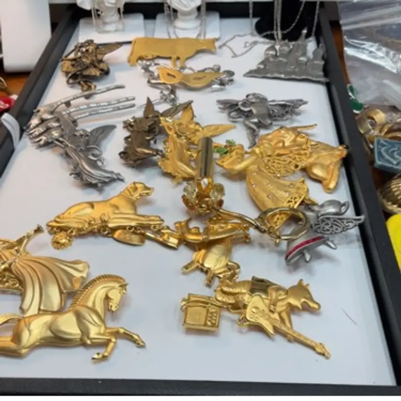 Welcome to our shop of mostly pre-owned and sometimes new jewelry treasures, trinket boxes, compacts - sometimes art and glass. Please follow us so you're in the know when we go live or add new items. Our curated beauties include a large selection of vintage pieces as well as many contemporary items. We also craft and design our own fun costume (and some fine) jewelry pieces, bookmarks, digital art and more in our small studio.