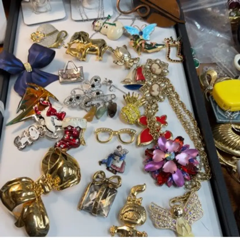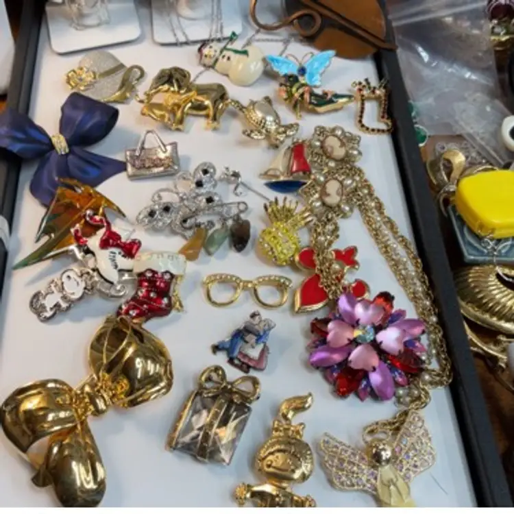 Welcome to our shop of mostly pre-owned and sometimes new jewelry treasures, trinket boxes, compacts - sometimes art and glass. Please follow us so you're in the know when we go live or add new items. Our curated beauties include a large selection of vintage pieces as well as many contemporary items. We also craft and design our own fun costume (and some fine) jewelry pieces, bookmarks, digital art and more in our small studio.
