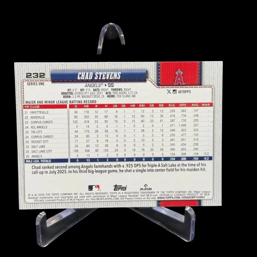 CHAD STEVENS 2026 TOPPS SERIES 1 #232 RC DIAMANTE PARALLEL LOS ANGELES ANGELS
