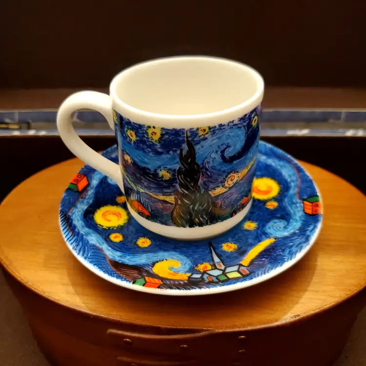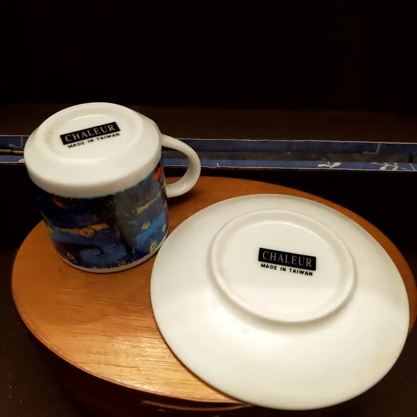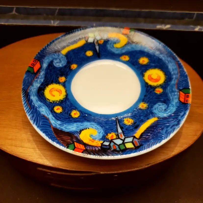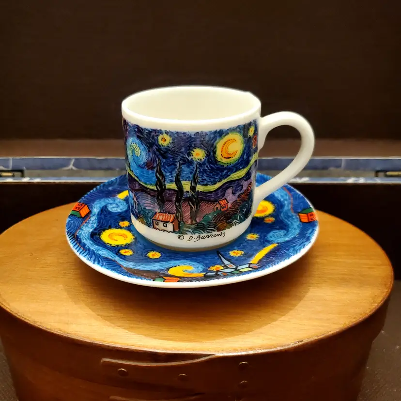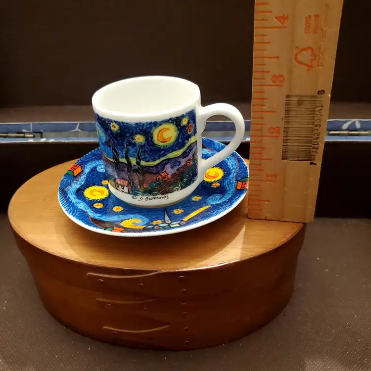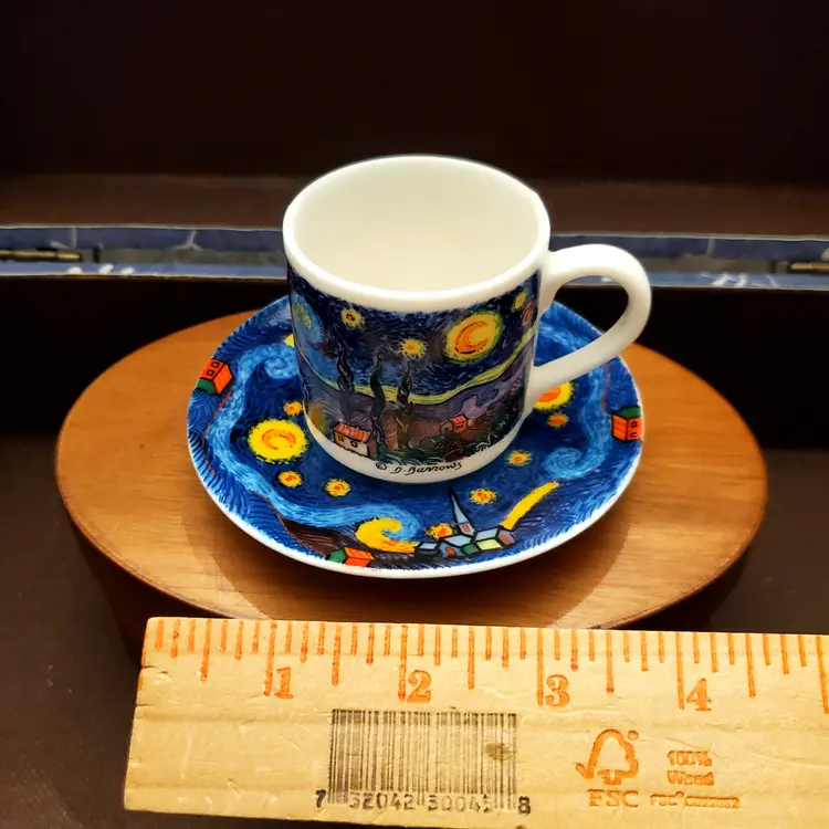 This is a beautiful ceramic espresso cup and saucer set. Features starry night motif. Approximate measurements in photos. No damage.