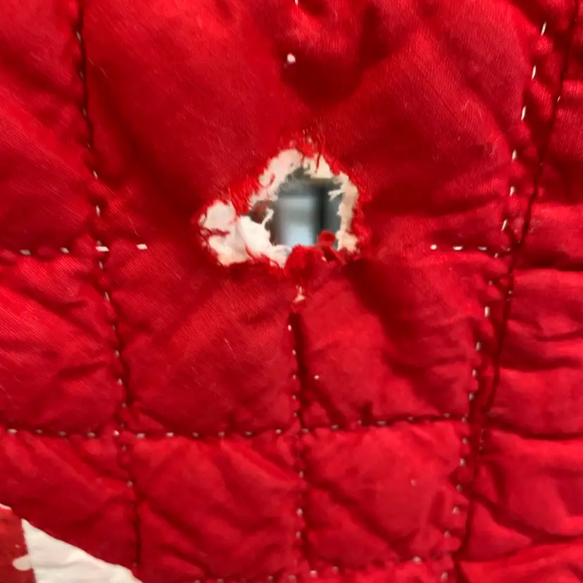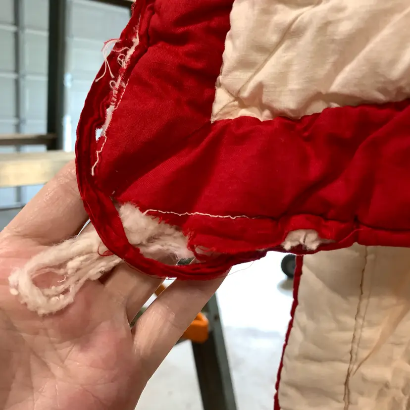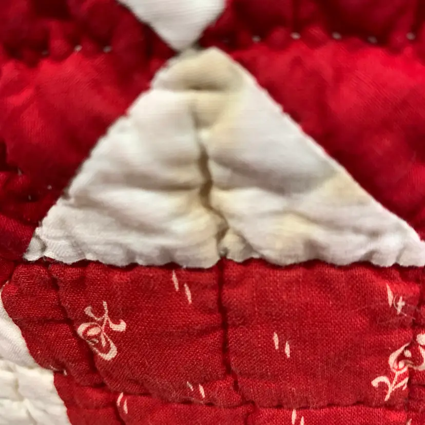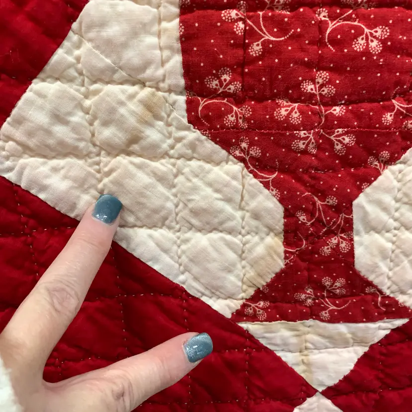 This is a very old quilt. It smelled bad when I purchased it. I worked very hard and was able to remove the smell and most of the stains. I am showing photos of all of the problem areas. Measures 63 inches by 78 inches. Weighs 4 pounds 2 ounces. If the actual postage ends up being less than what you paid, you will be refunded for anything over one dollar.
