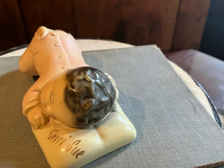 Condition: This piece is personalized with the name Terri Sue. There are 3 chips to the paint/chalkware, one in her hair, one on her arm and one one her bottom. There is vintage felt on the base of the piece.
