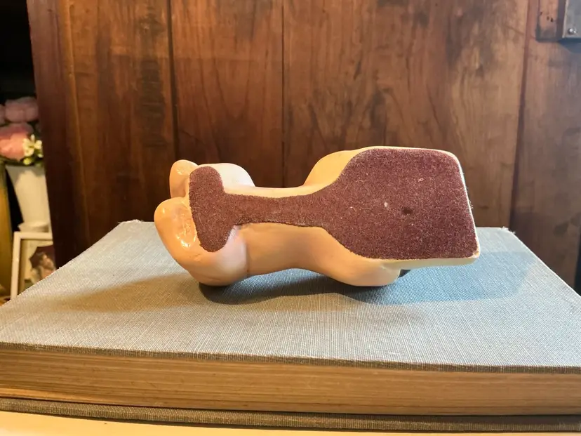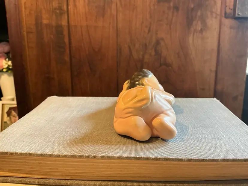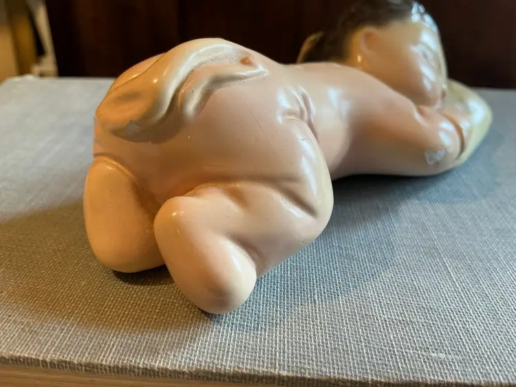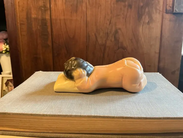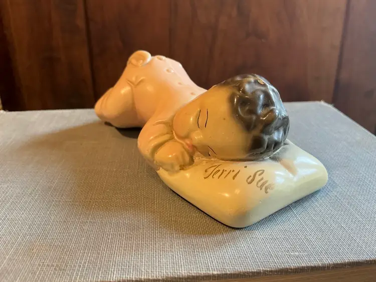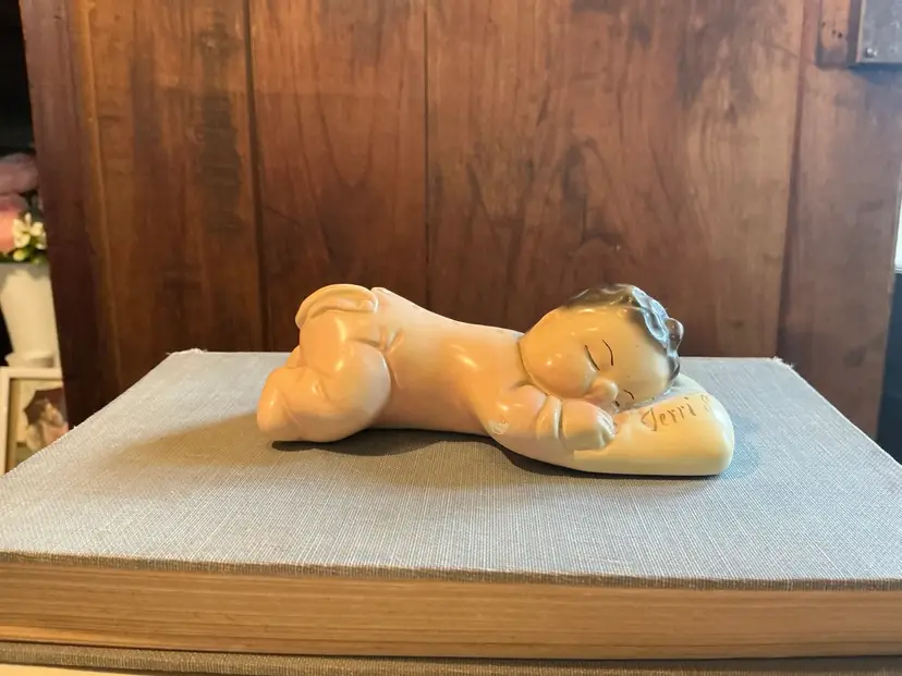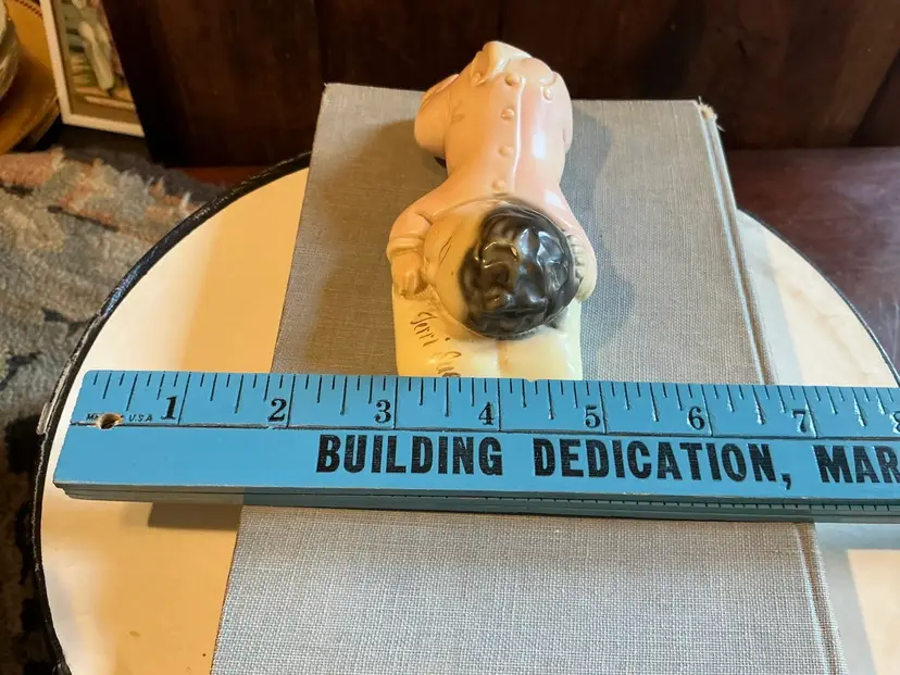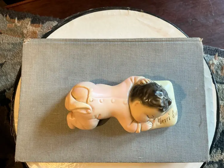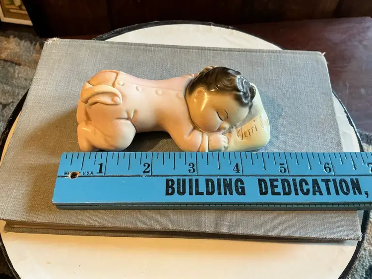 This Chalkware Baby figurine was made by Schmidt in Japan in the 1950’s. It was made for the “Blessed Child” collection. The baby is sucking its thumb and wearing pink Long John PJ’s.
