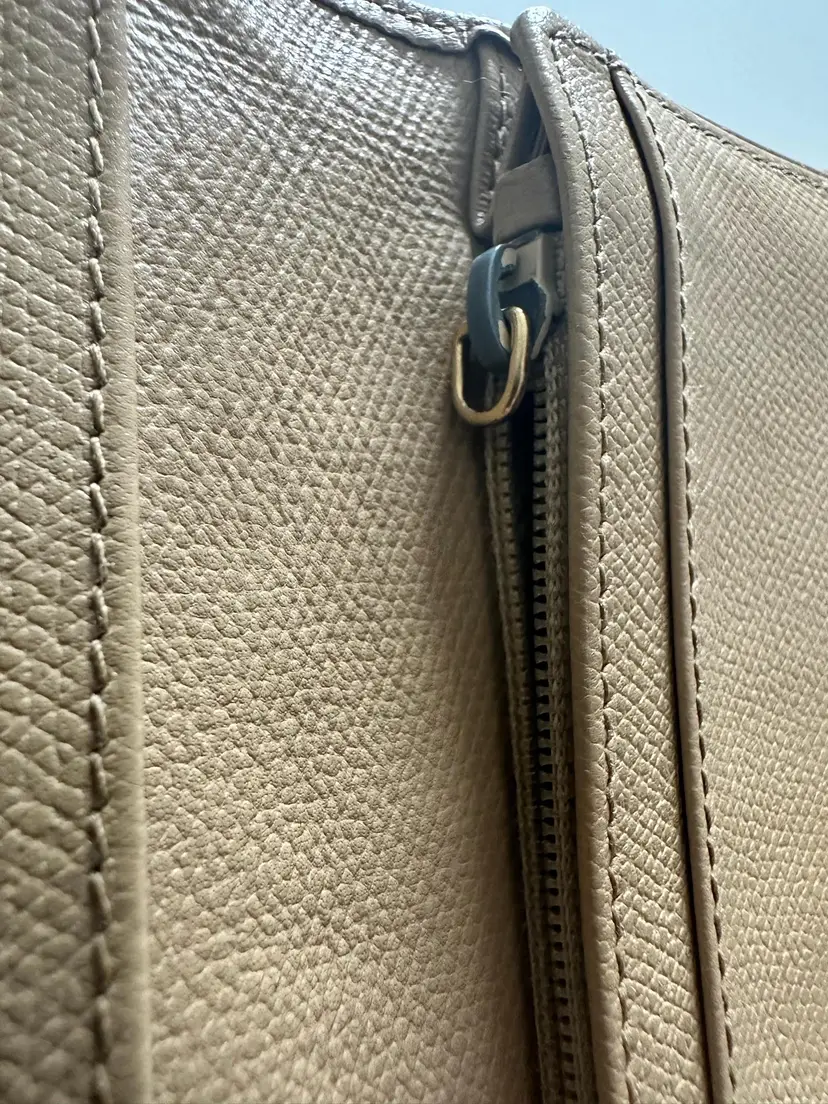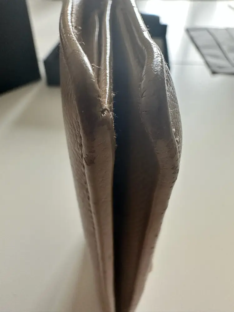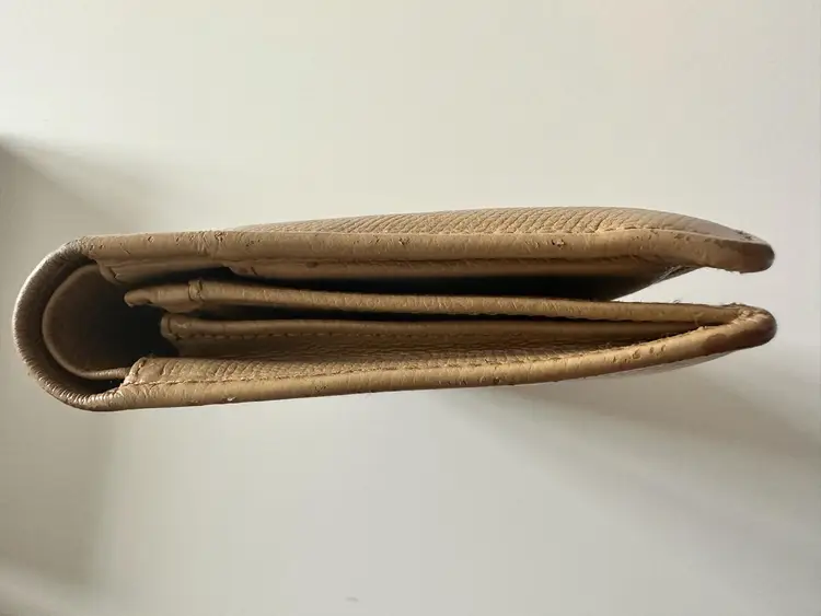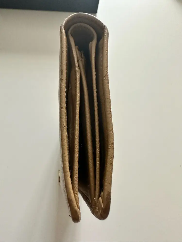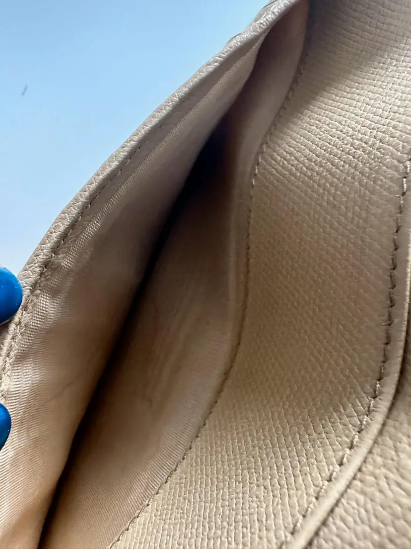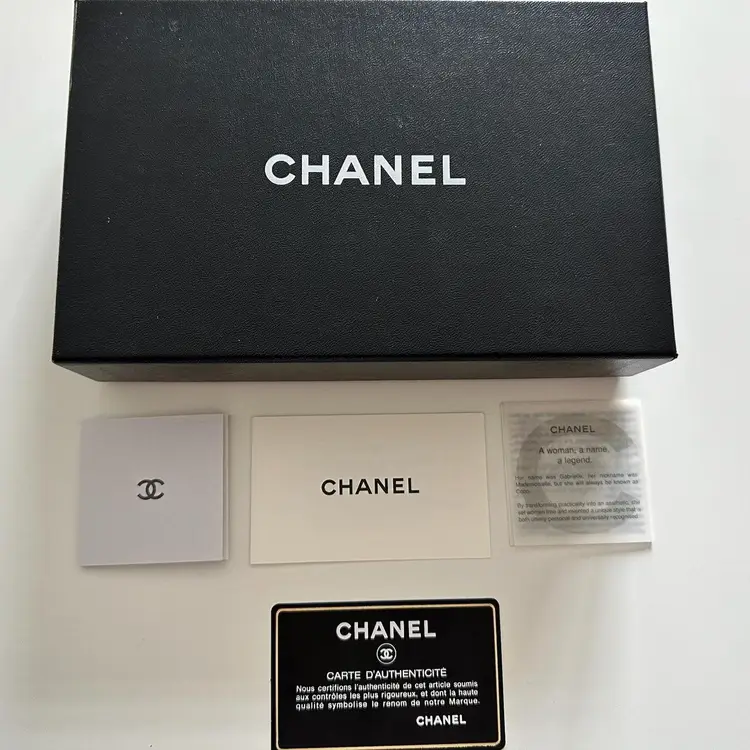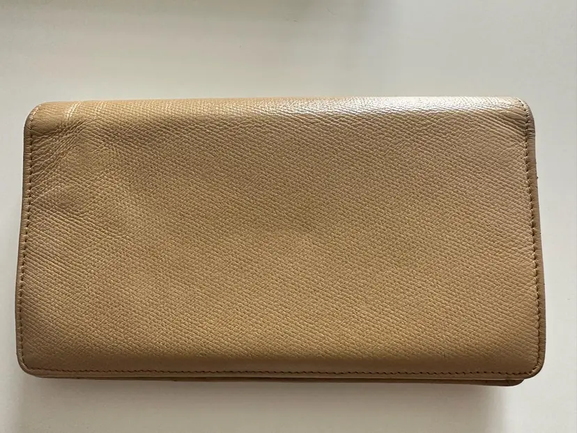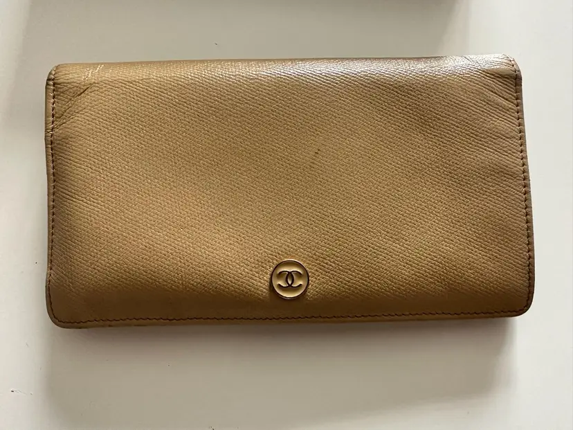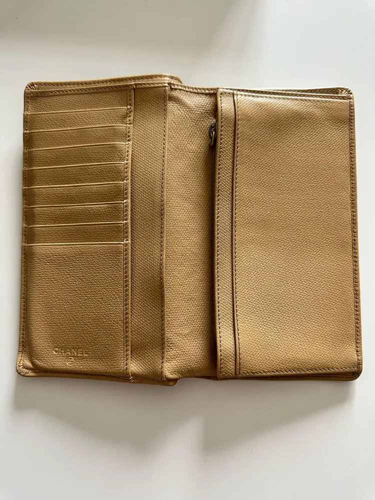 Chanel Bifold Coco Button Beige. w/box and card condition: preloved wear: in good used condition, slight bending and scuffs at corners, interior has wear at coin compartment, minor scratch at exterior, missing zipper pull. credit card slots, 5 cash slots, 1 zipper slot. 1 extra large/long cash slot Hologram in pristine condition. serial code: 10073603 (2005-2006 series)