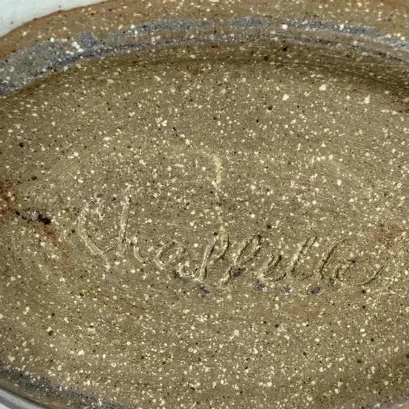 Chappelle signed Happy Valley Studio in Georgia. Pottery trinket dish. Made of clay using pottery techniques in Georgia. Colorful design. Excellent condition. Pre-owned. Approximately 6 1/2” long and 4 1/2” wide and .8" tall. Weighs 8 ounces.