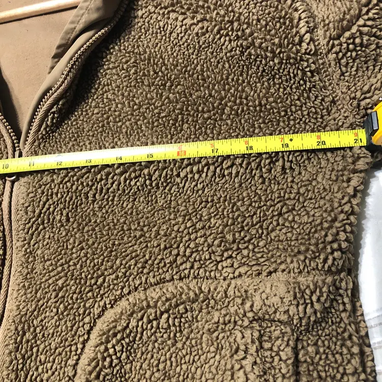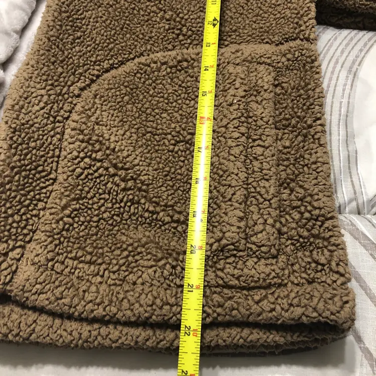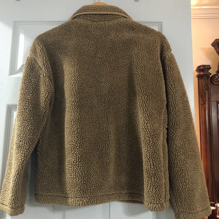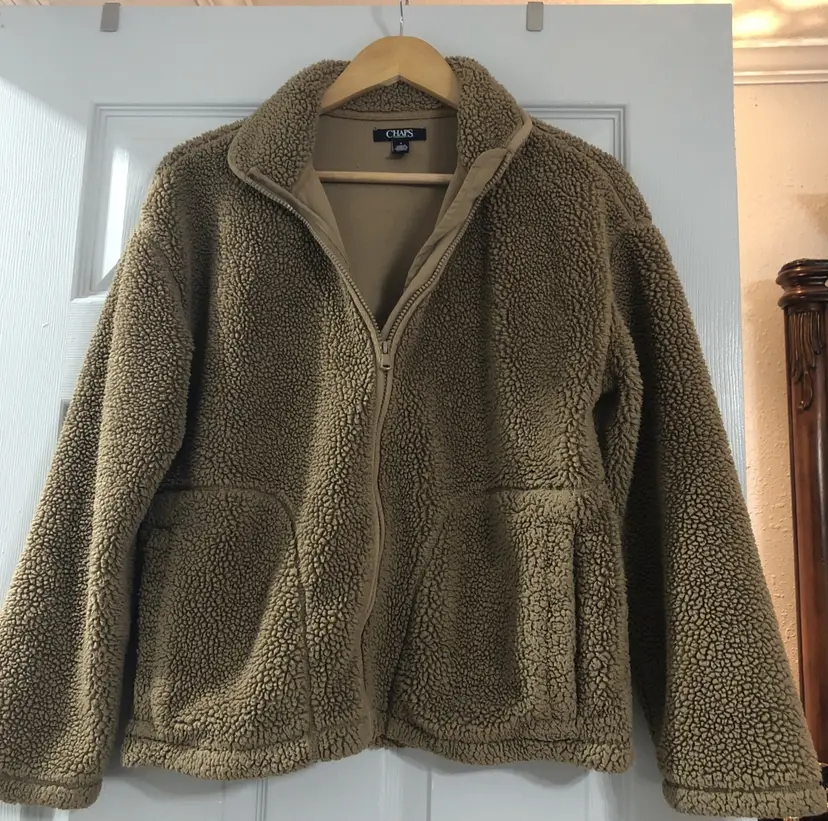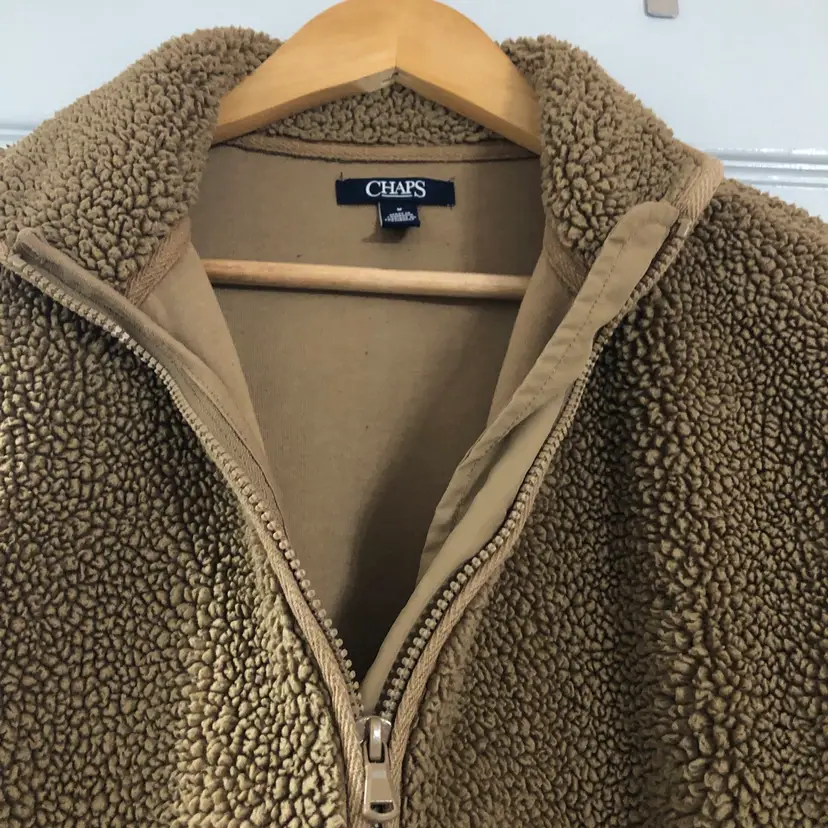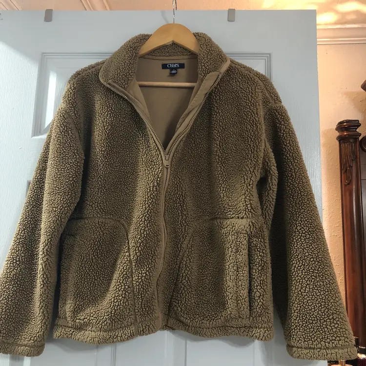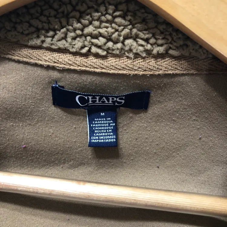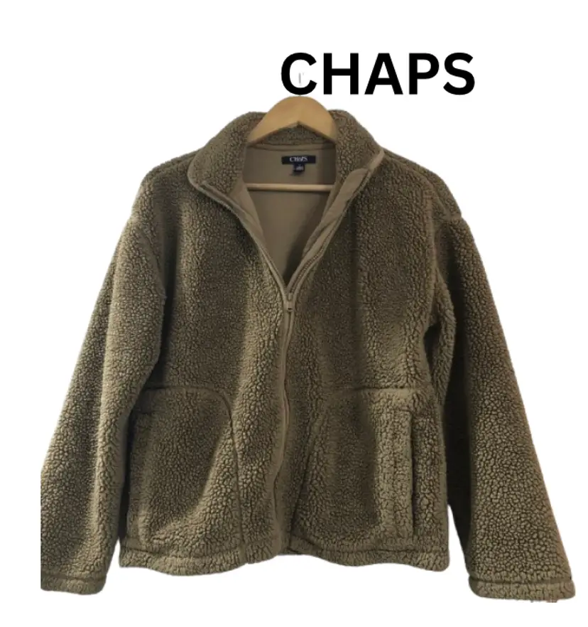 Item Description: Chaps Sherpa Jacket in brown color, size Medium. Made in Cambodia. Full zip closure with mock neck collar and two side pockets. Soft, warm, and comfortable sherpa fabric – perfect for fall and winter wear. Can be worn by men or women (unisex fit).