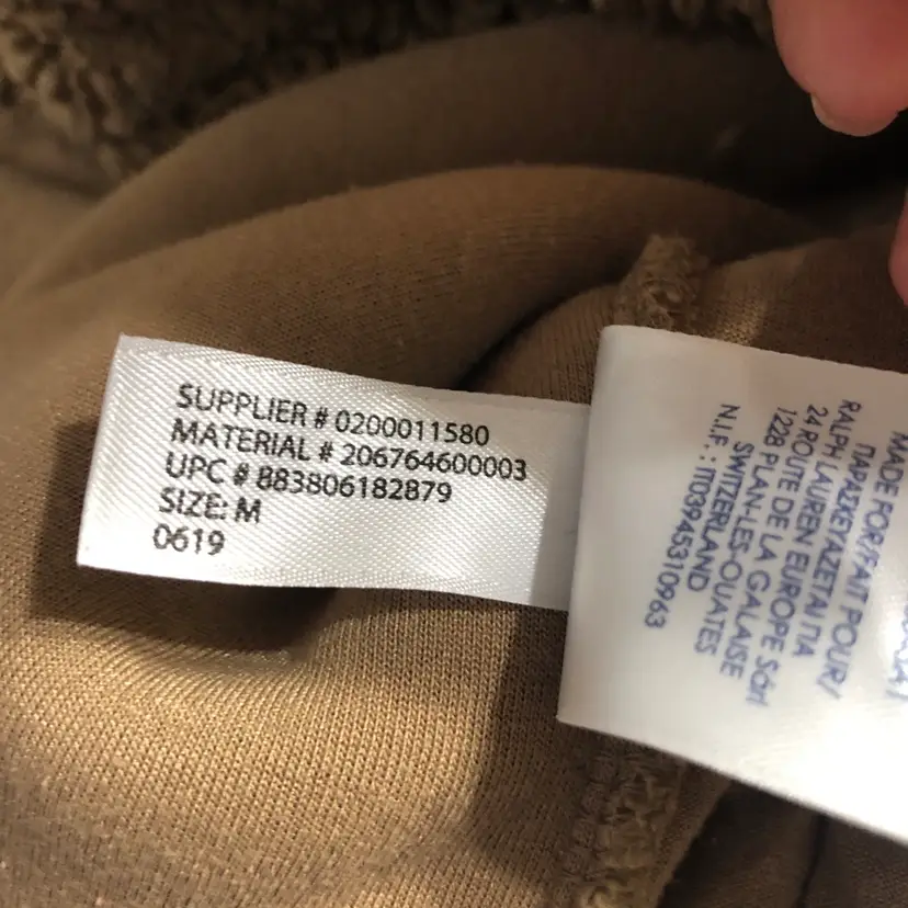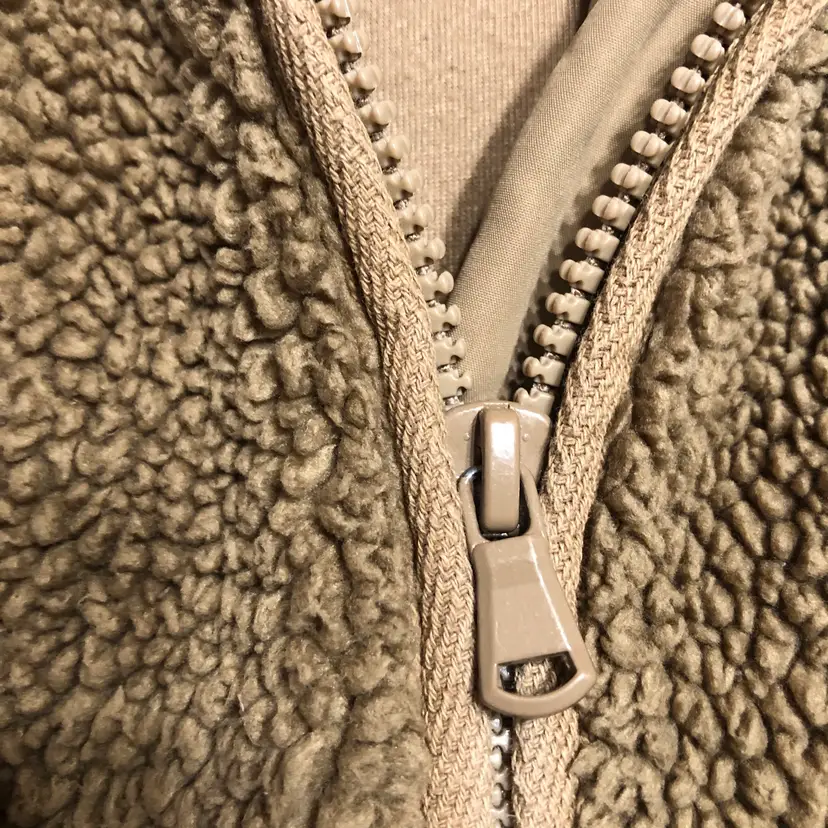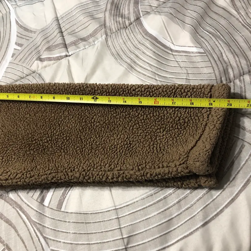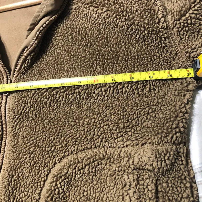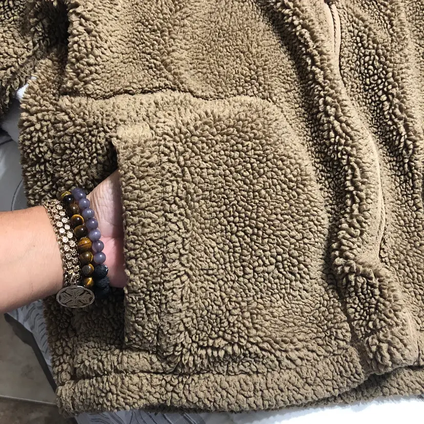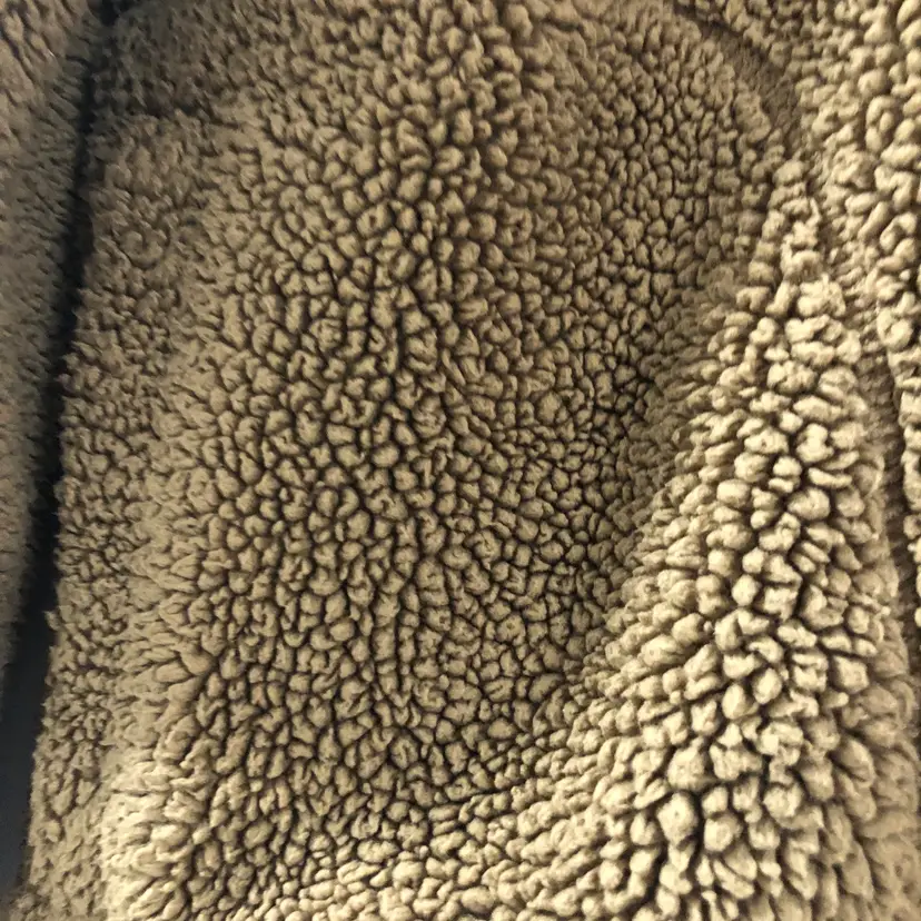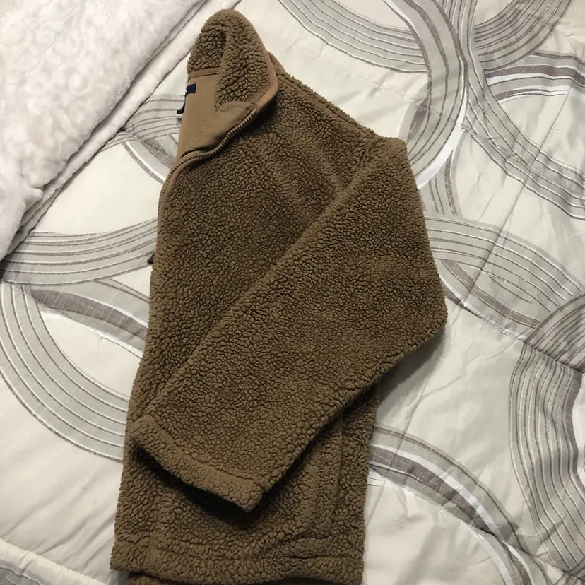 Item Description: Chaps Sherpa Jacket in brown color, size Medium. Made in Cambodia. Full zip closure with mock neck collar and two side pockets. Soft, warm, and comfortable sherpa fabric – perfect for fall and winter wear. Can be worn by men or women (unisex fit).