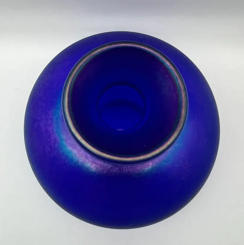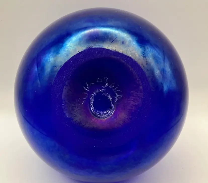 Beautiful iridescent blues and purples art glass vase by a California artist Charles Keeling. Signed CJK -03. No chips or cracks Approximately 4” tall 5” wide