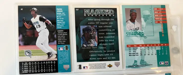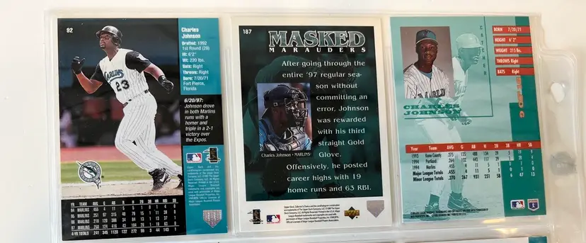 Florida Marlins on card. 1995 Gold Leaf Rookies, 1998 Collector’s Choice Masked Marauders, 1998 Upper Deck. $1.50 shipping via non machinable PWE (stacks with other listings)