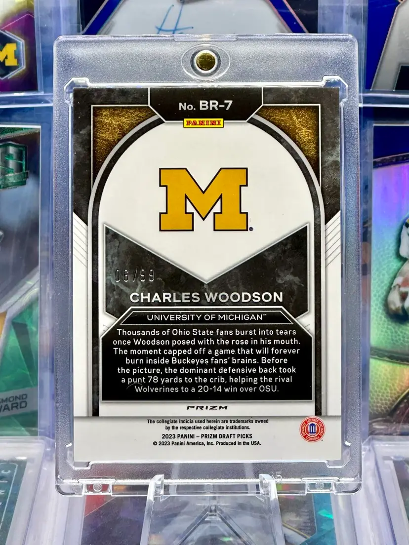 Charles Woodson 2023 Panini Prizm Draft Picks BRILLIANCE Blue Cracked Ice COLOR MATCH Blue Prizm Refractor Serial Number Numbered #’d #’d /99 Holo SP Short Print In Wearing Michigan Uniform Uni Insert Parallel University of Michigan Wolverines GO BLUE! Raiders Packers NCAA NFL Football Card