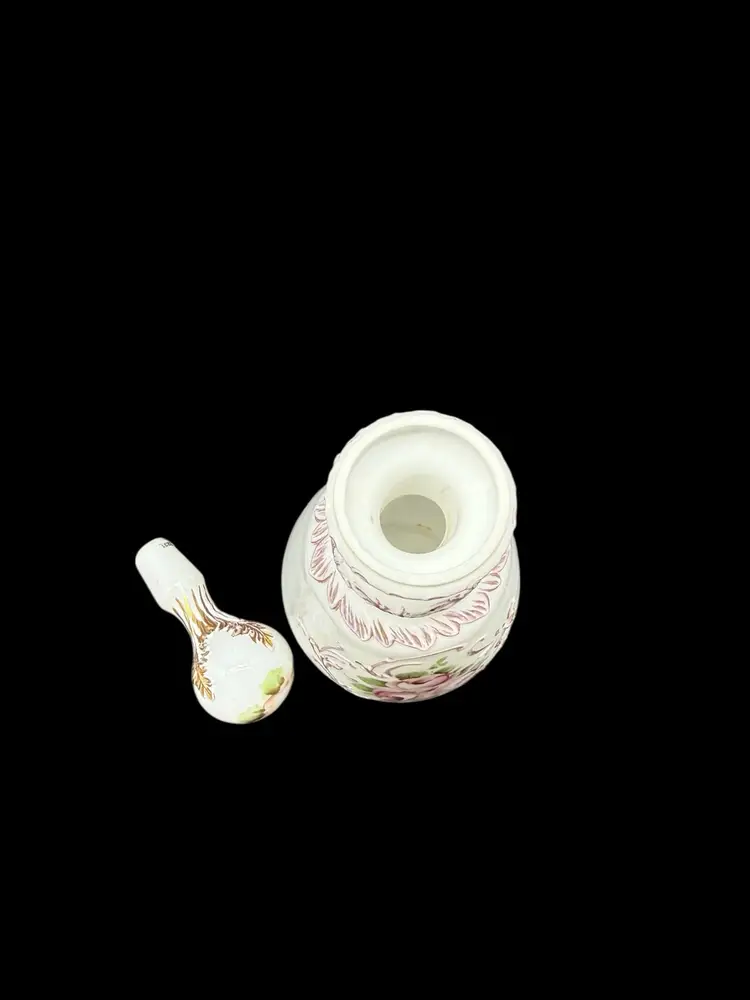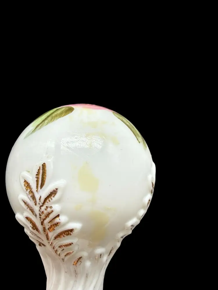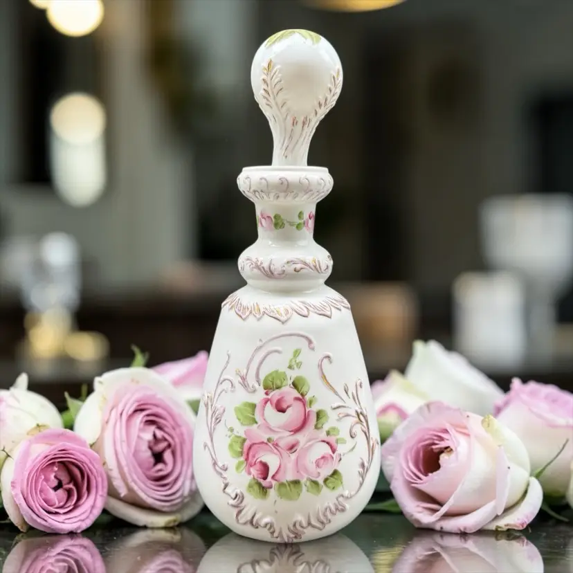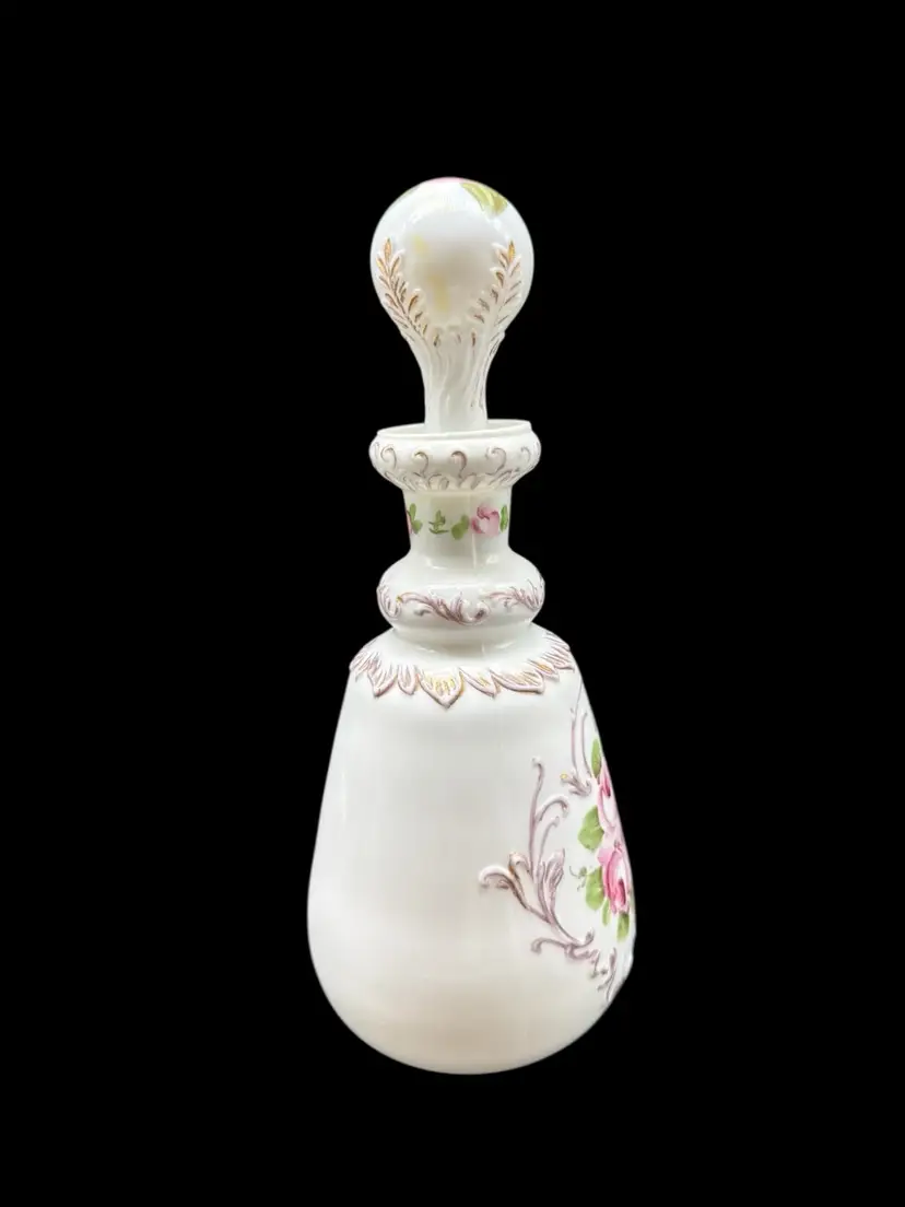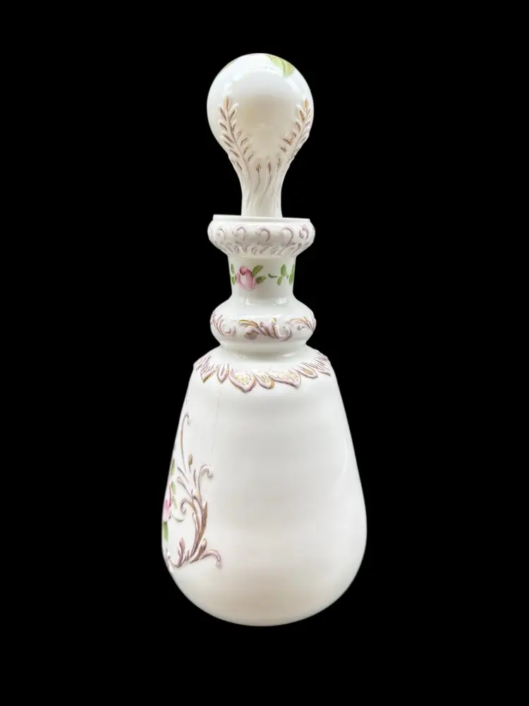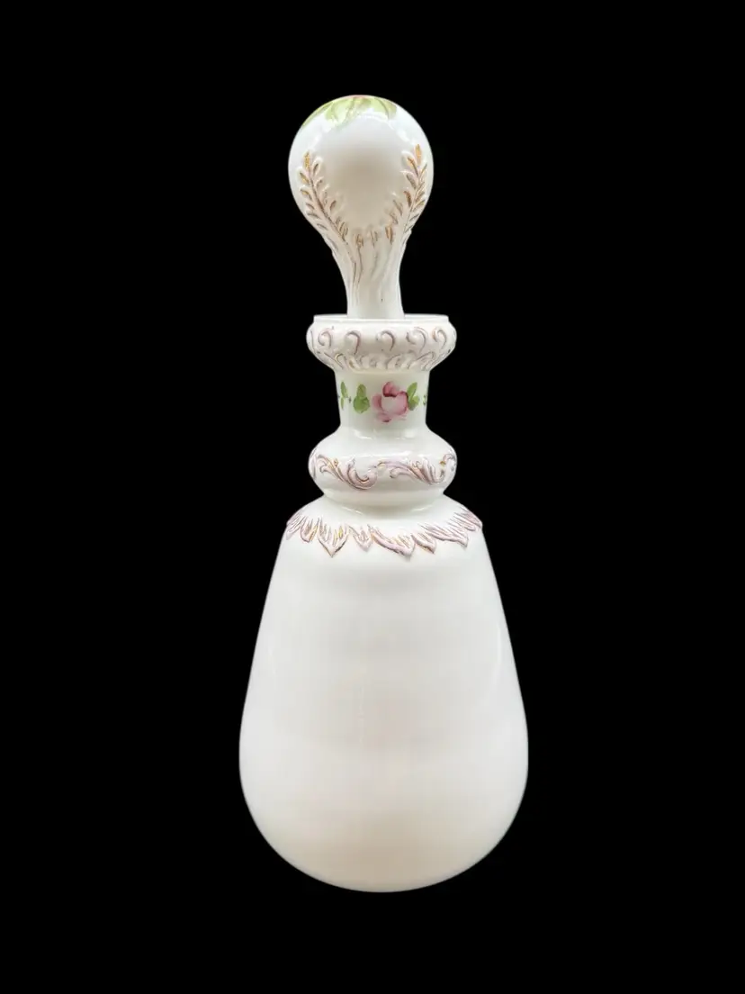 The Charleton Roses Milk Glass Dresser Bottle by Kemple Glass is a Victorian-style decorative collectible featuring hand-painted flowers. Made of milk glass with a multi-color design, this original piece was crafted in the United States post-1940. The vanity bottle comes with a stopper, adding a touch of elegance and charm to any vanity or dresser. Perfect for collectors of decorative glassware or those looking to add a unique touch to their home decor.