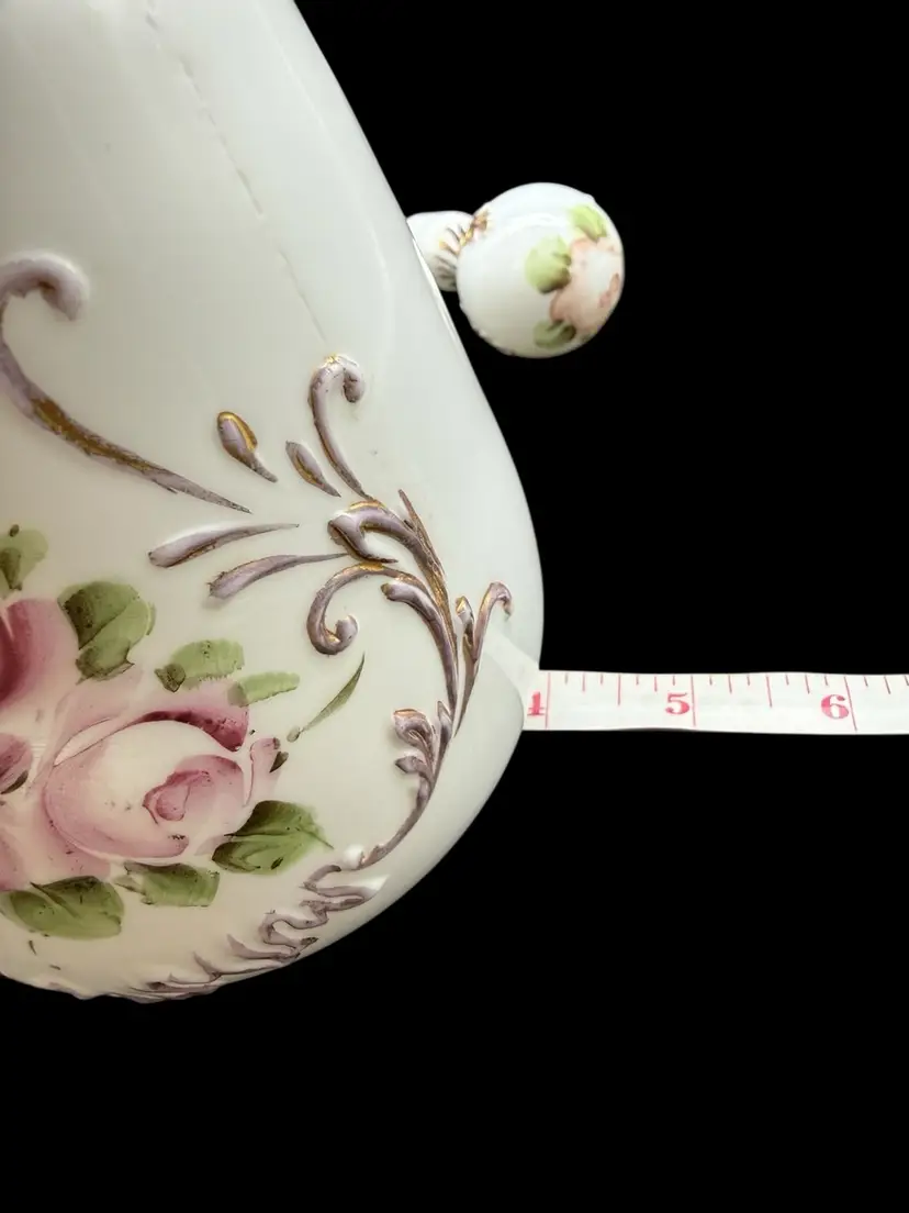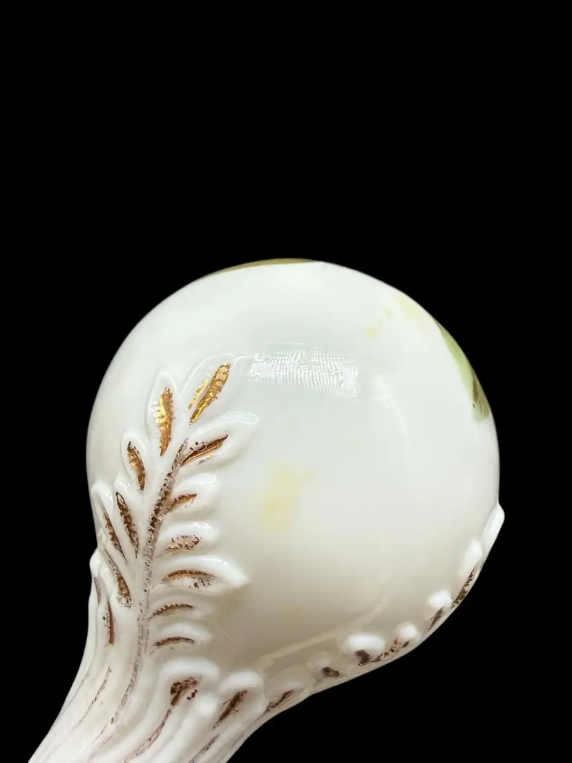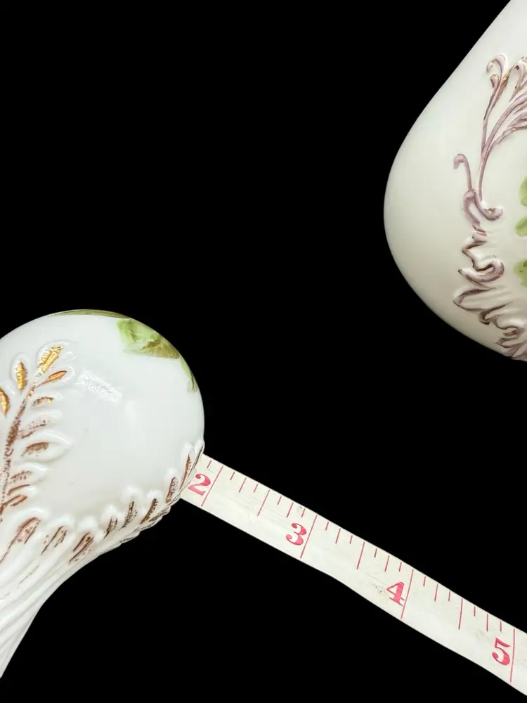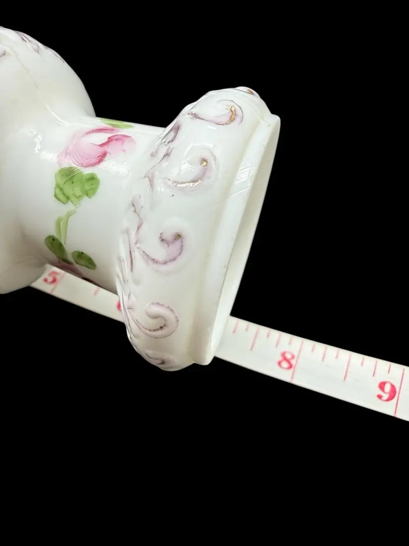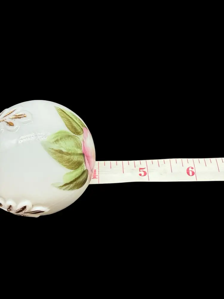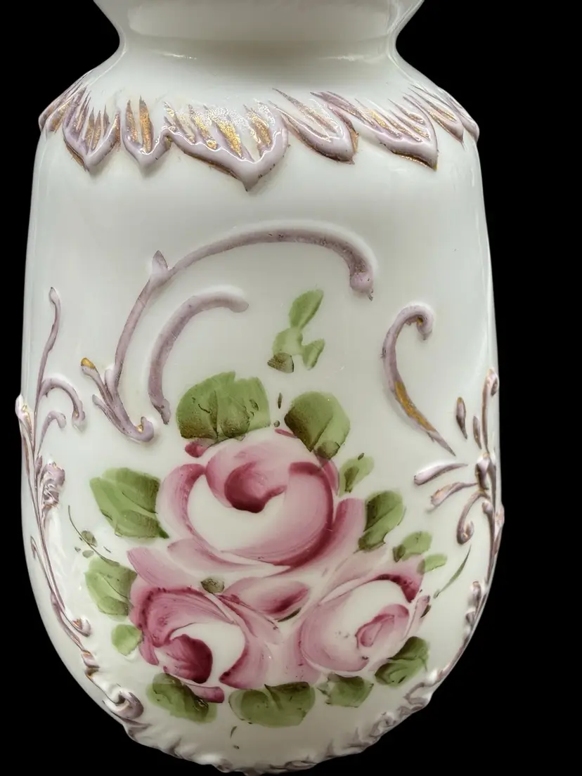 The Charleton Roses Milk Glass Dresser Bottle by Kemple Glass is a Victorian-style decorative collectible featuring hand-painted flowers. Made of milk glass with a multi-color design, this original piece was crafted in the United States post-1940. The vanity bottle comes with a stopper, adding a touch of elegance and charm to any vanity or dresser. Perfect for collectors of decorative glassware or those looking to add a unique touch to their home decor.