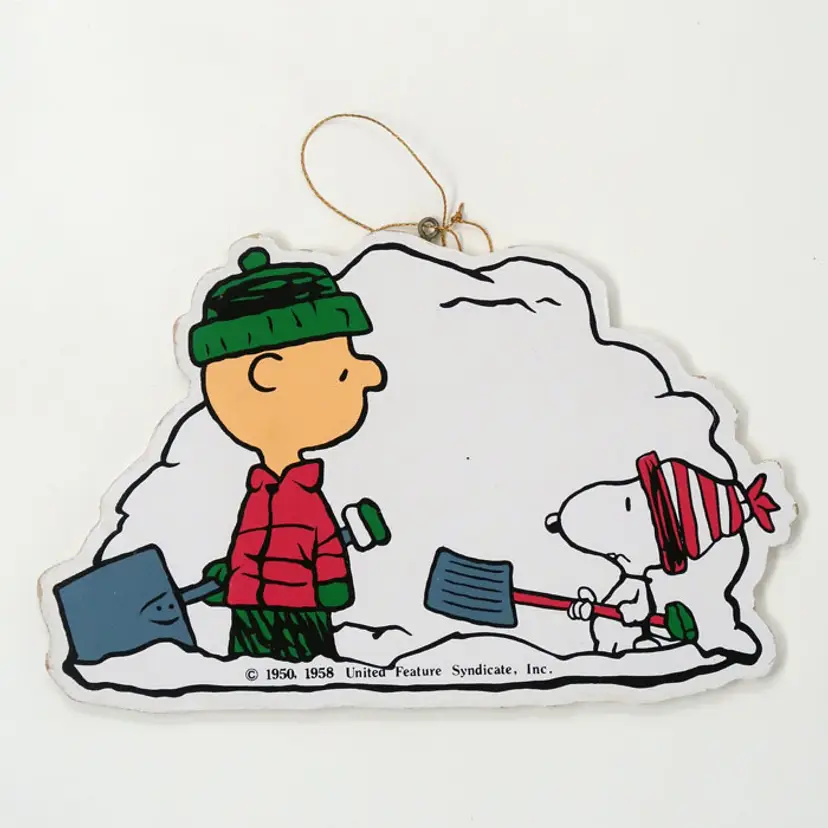 Snoopy's being a big help to Charlie Brown! The snow is piling up, and they're getting it shoveled. Put this Peanuts ornament on your Christmas tree as a reminder to all your pets on how they let you down each Winter by not helping with the endless shoveling. This vintage 1980s Silvestri Christmas Ornament is made of wood and shows some minor signs of age and use.