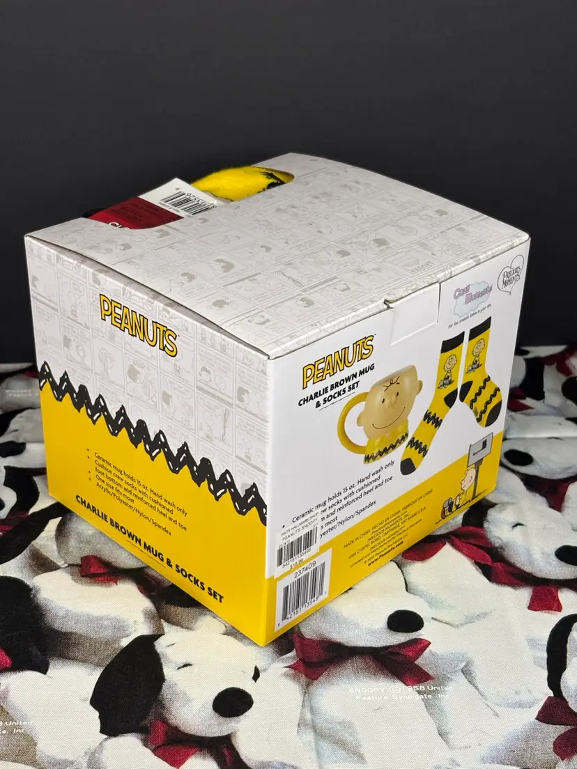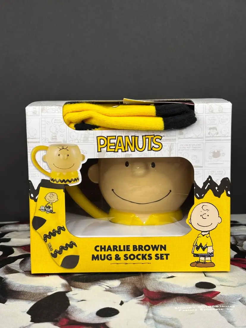 Super cute Charlie Brown shaped mug. Comes with a pair of socks as seen in the photos. New with box. Note that the tag that was on the socks is not attached, but it is present. Add this fun set to your collection today!