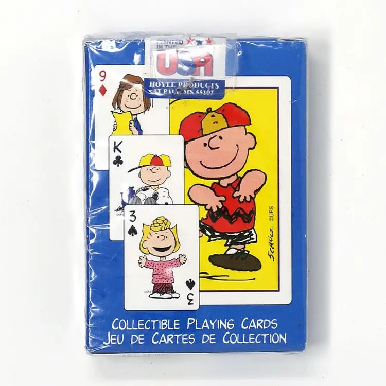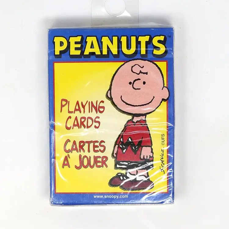 Enjoy game night with this charming deck of Charlie Brown Playing Cards. Featuring the beloved Peanuts characters on the front and back, this deck is perfect for fans of all ages. Made by Hoyle and in original plastic wrap.