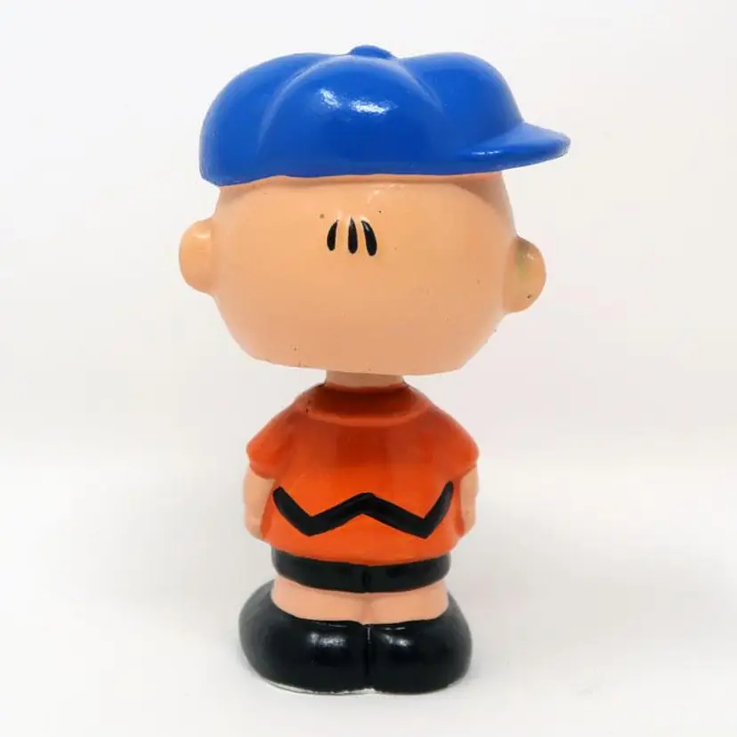 This charming Charlie Brown bobblehead stands about 4 inches tall and features him wearing his classic orange zigzag shirt and a blue cap. A delightful addition to any Peanuts collection, perfect for fans of all ages. Made by Determined Productions in the 1970s.