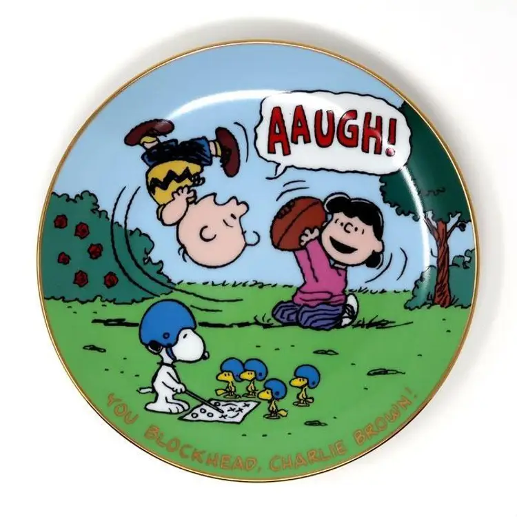 Celebrate classic Peanuts humor with this 'You Blockhead, Charlie Brown!' decorative plate. Featuring Charlie Brown, Lucy, and Snoopy in a playful scene, it's a must-have for any fan. Perfect for display, this plate adds a touch of nostalgia to your collection. Made by Danbury Mint for the Peanuts Magical Moments collection. In excellent condition.