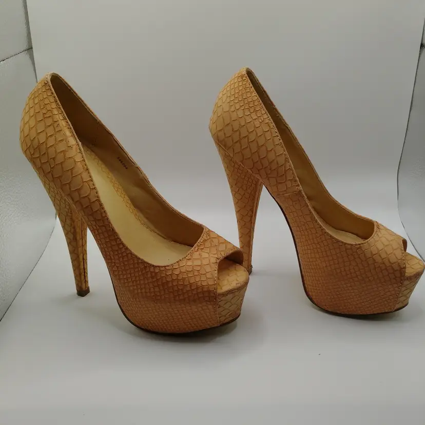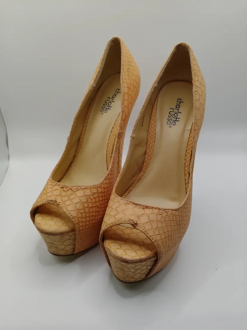 These Charlotte Russe tan peep toe wedges are a stylish and comfortable choice for casual occasions. Featuring a slip-on closure and a high 5.5-inch heel, these espadrille-style sandals are a trendy addition to any outfit. Made with faux leather outsole and leather lining, these size 6 shoes are designed for standard shoe width and are perfect for women looking for a fashionable yet practical option in footwear.