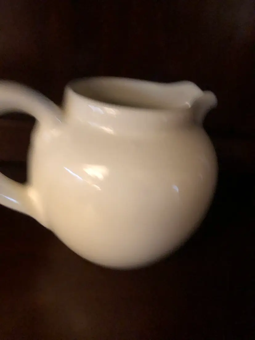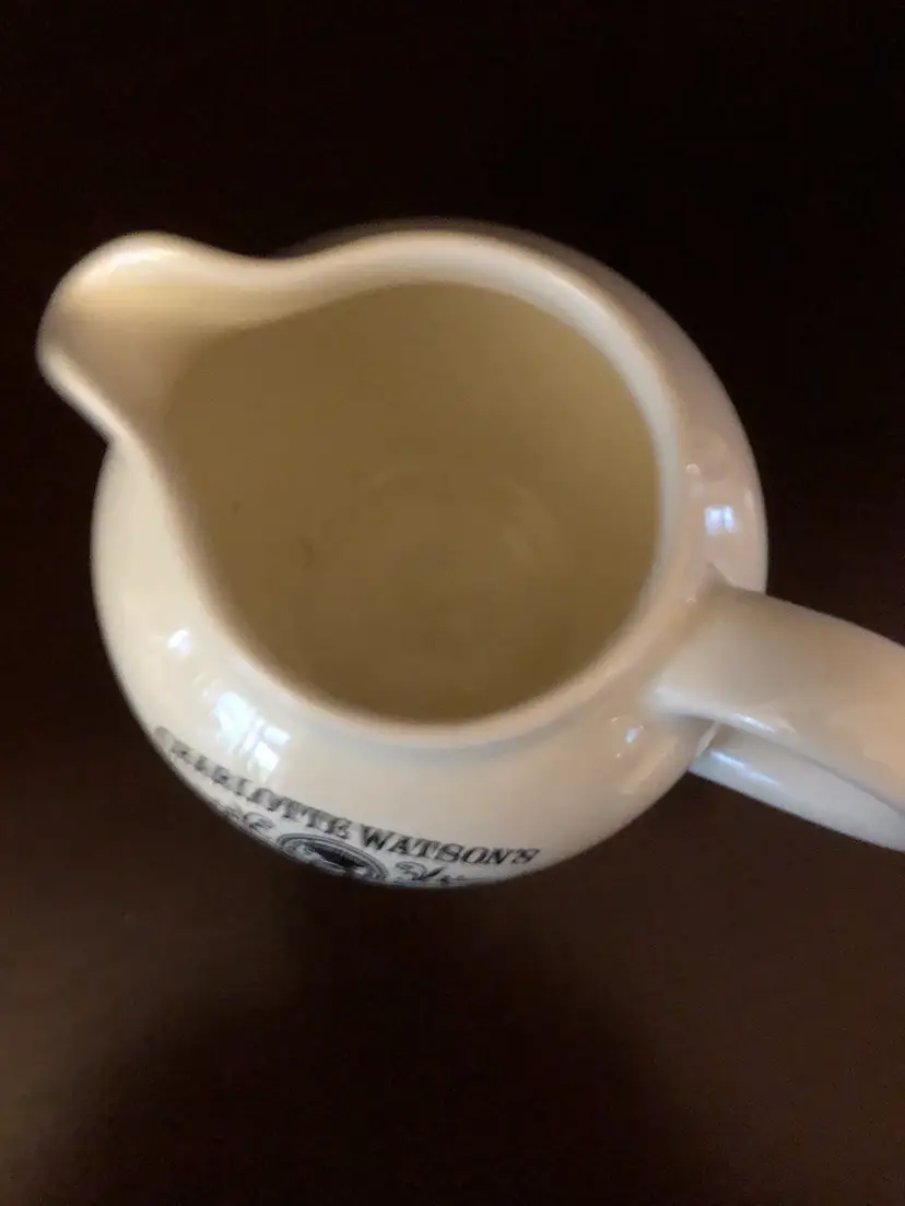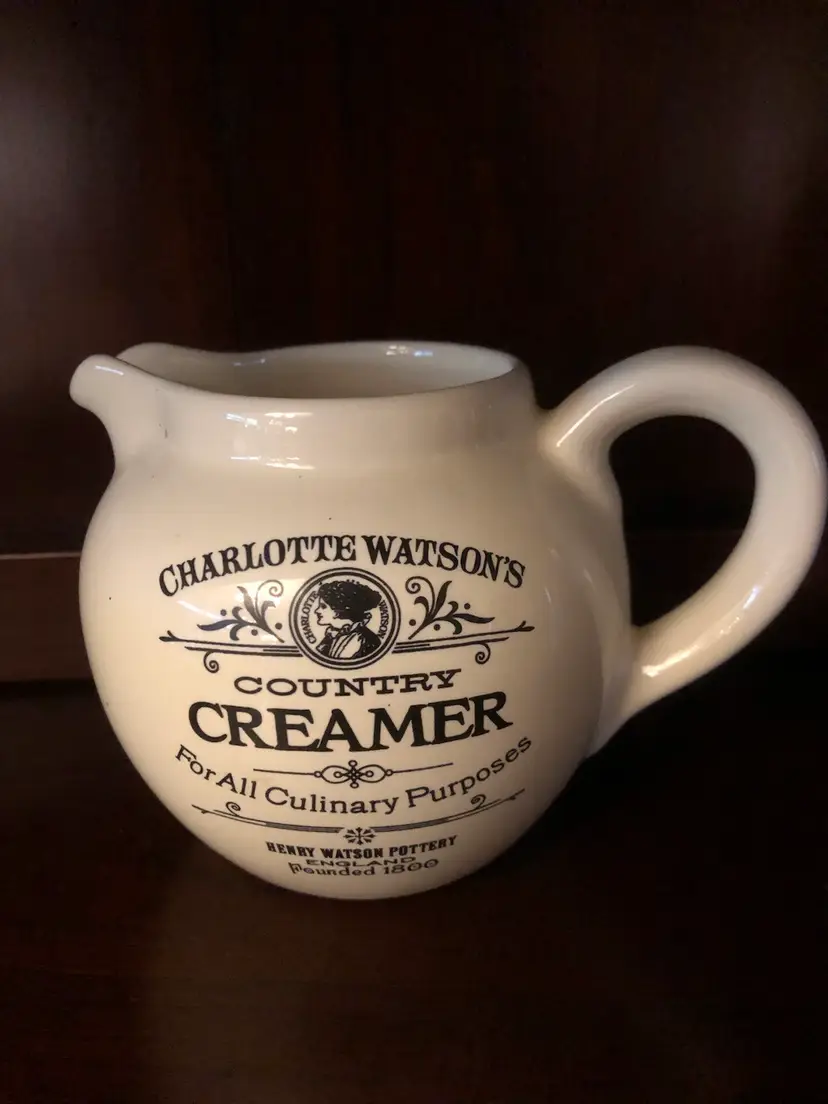 Charlotte Watson's Country Creamer from Henry Watson Pottery. This creamer is part of the Charlotte Watson Country Collection, known for its rustic charm and traditional design. It's a half-pint jug made by Henry Watson Pottery, an English company founded in the early 1800s. The creamer is made of ceramic in a rich cream color with black writing, featuring a silhouette of Charlotte Watson. It is described as dishwasher and microwave safe. This item is suitable for serving various liquids like milk, cream, or sauces, and can also be a decorative piece in a country or farmhouse-style kitchen