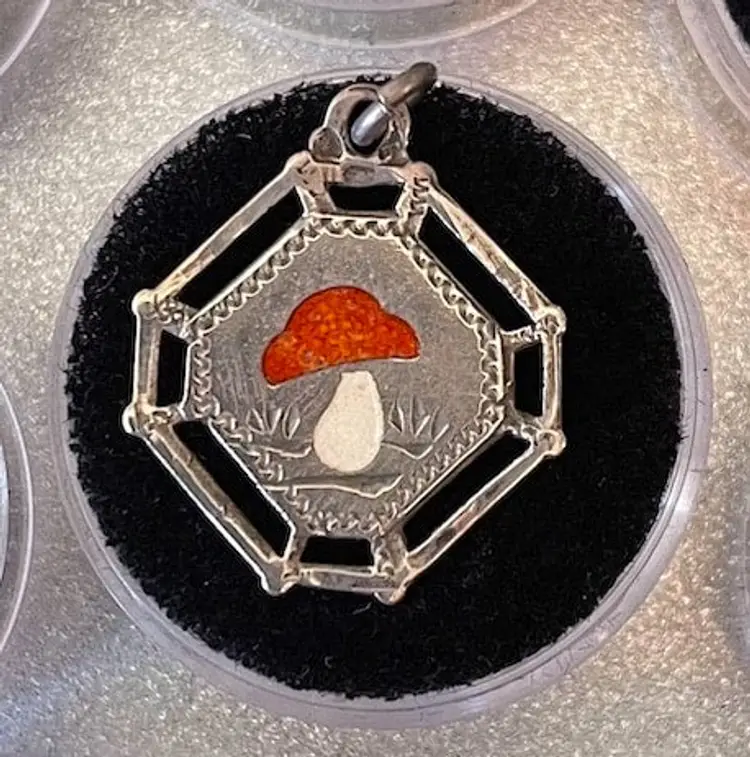 Charm - Antique Austrian Enamel Lucky Mushroom Octagon shaped - Silver
