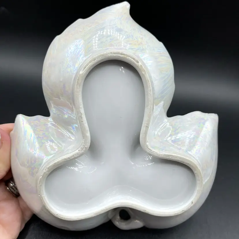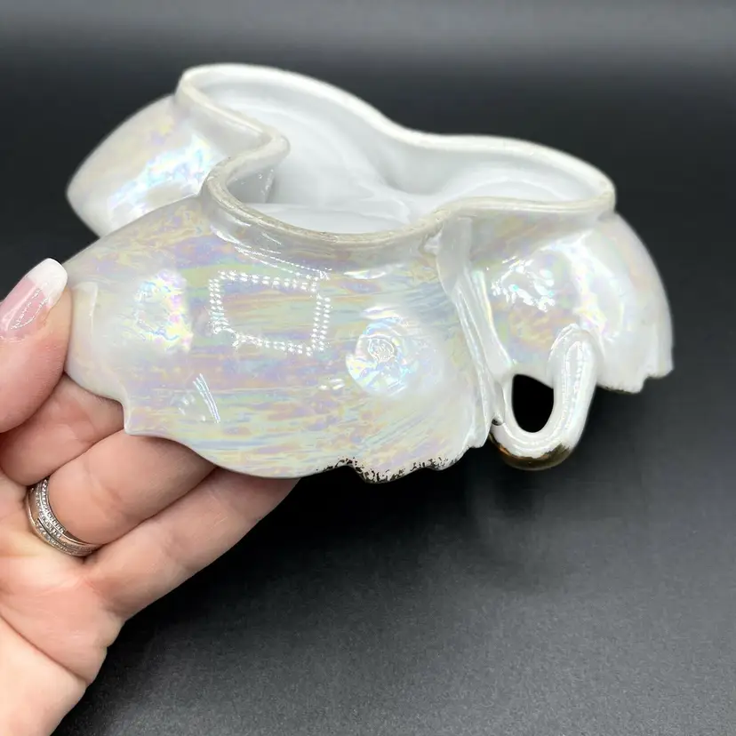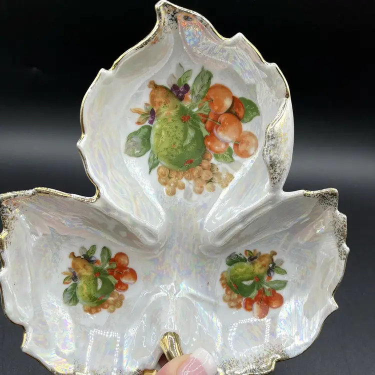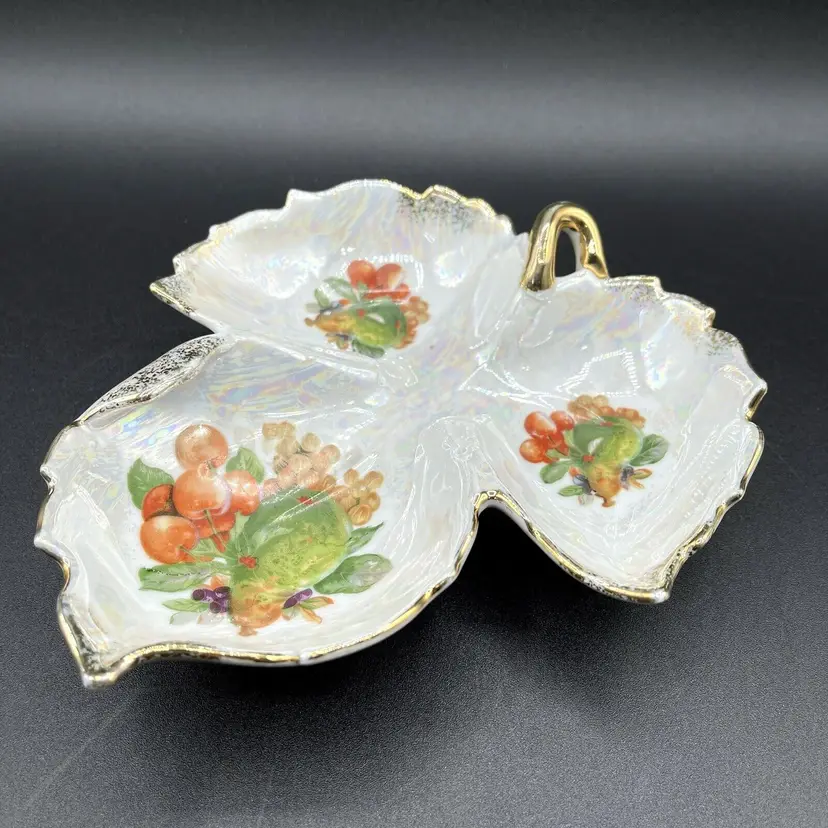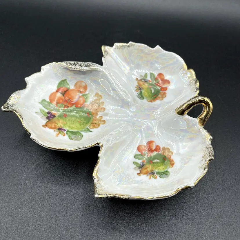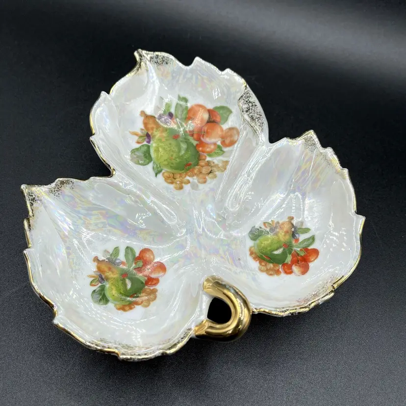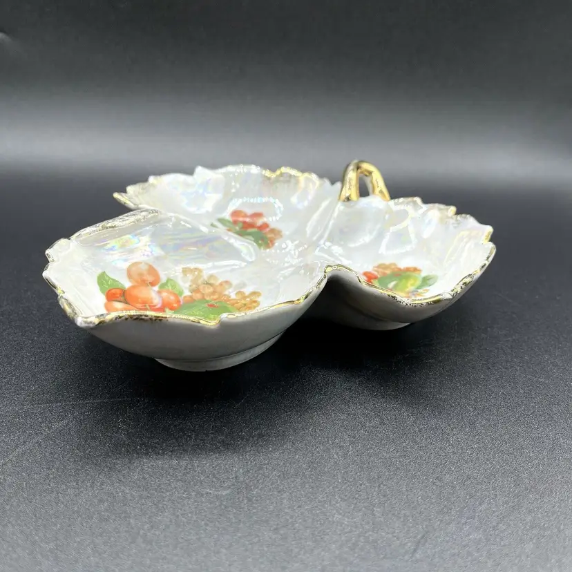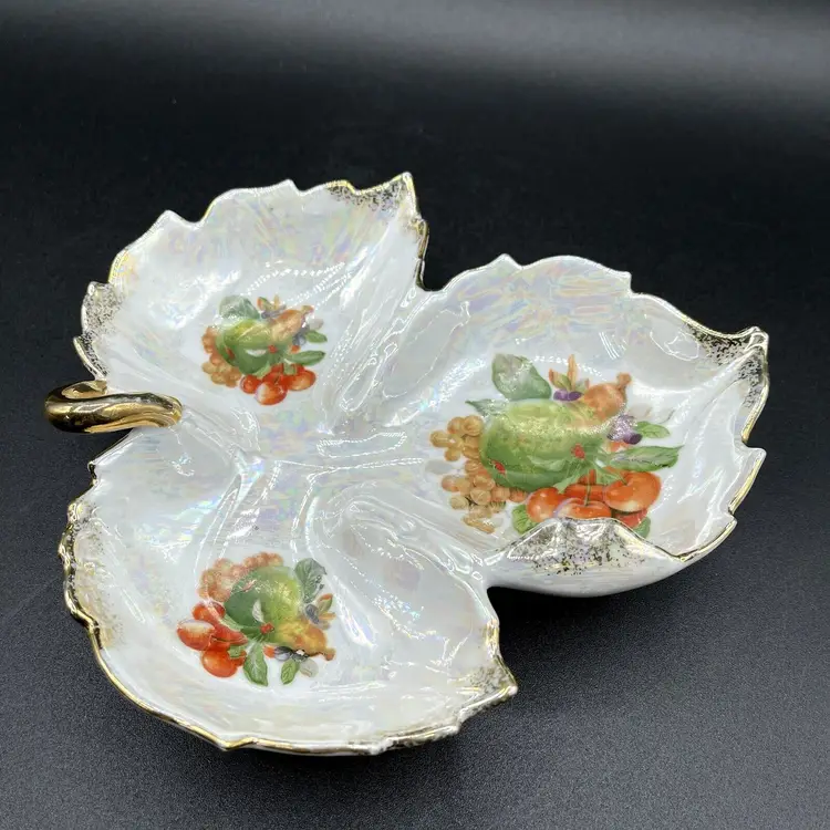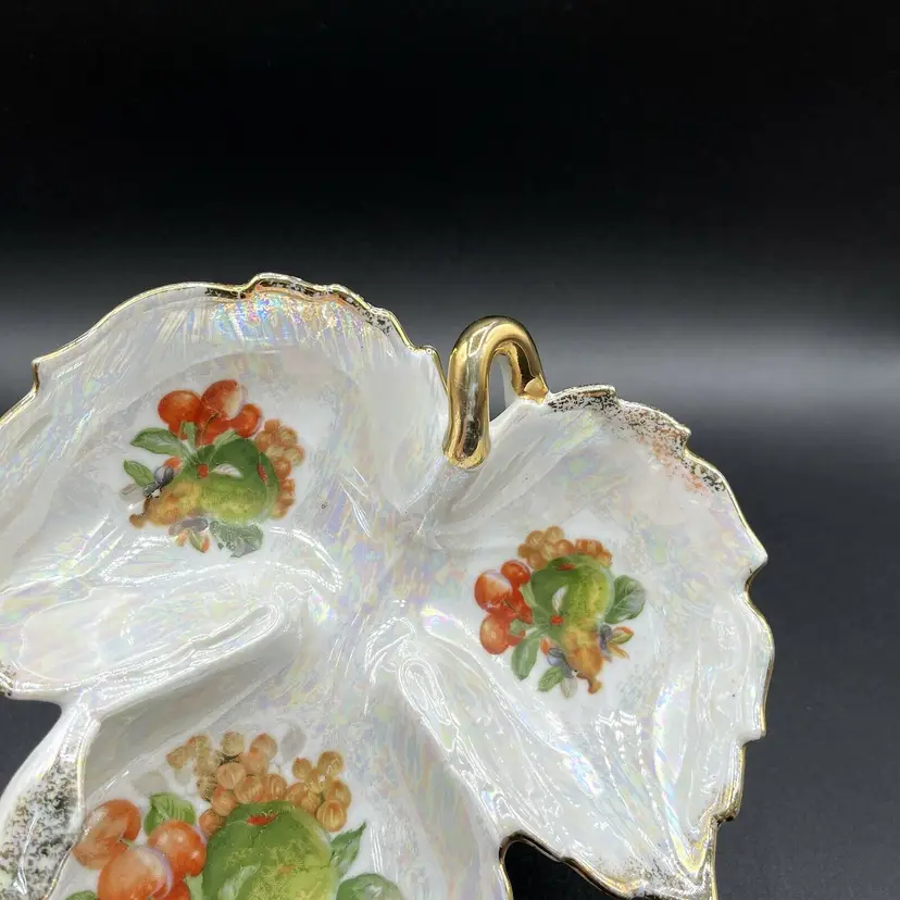 This ceramic figural leaf shaped 3 section divided bowl is perfect for a candy or nut dish. It features an applied fruit design along with gold brush on all the edges and the handle. It is white with an iridescent lusterware shine. There are no markings on the bottom. It is in excellent condition. There are no cracks, breaks, chips or repairs. There is a small brown spot inside the dish and a glaze miss on the backside. (See photos). It is 1.5" tall and measures 7"x6.5".