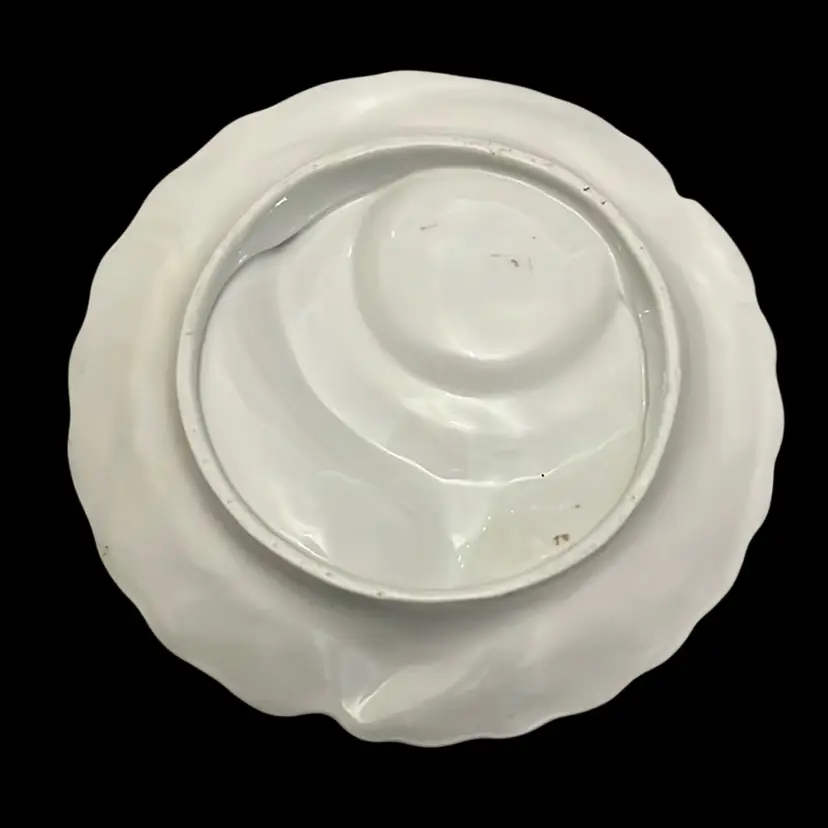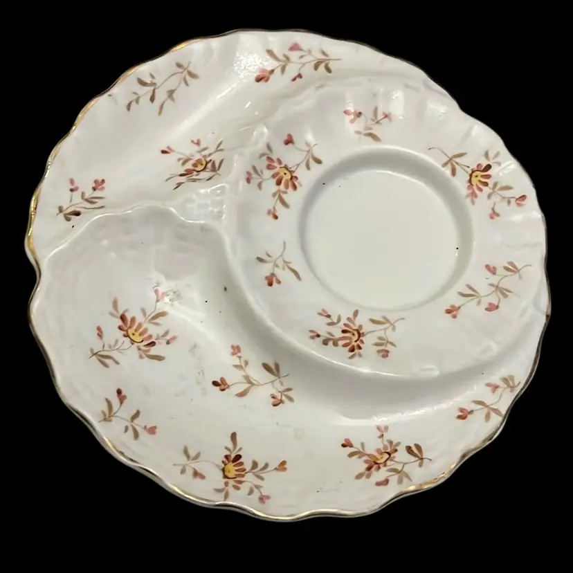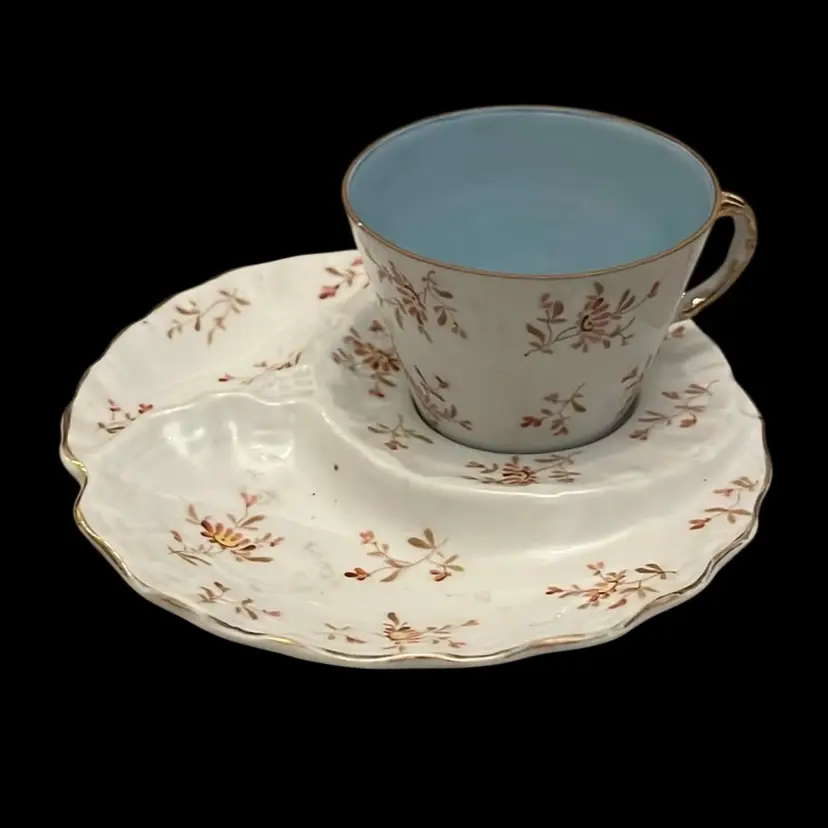 This snack set, with its floral motif and blue interior, is characteristic of mid-20th-century decorative arts. Such pieces were popular for afternoon tea rituals and were often produced by well-known ceramic manufacturers. The combination of delicate floral patterns and gold trim reflects the enduring appeal of traditional aesthetics in tableware.