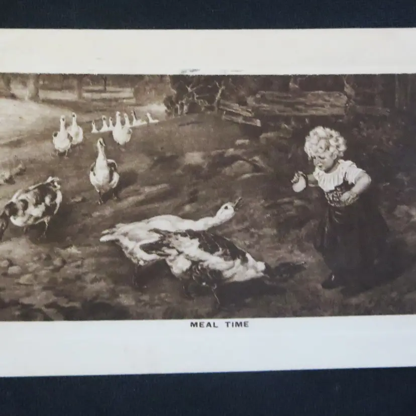 This charming post card is called meal time shows a young girl feeding geese. Posted 1910 from Denver, Colorado.