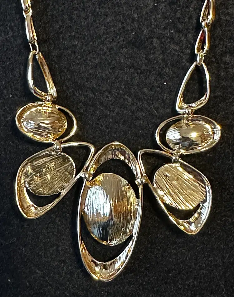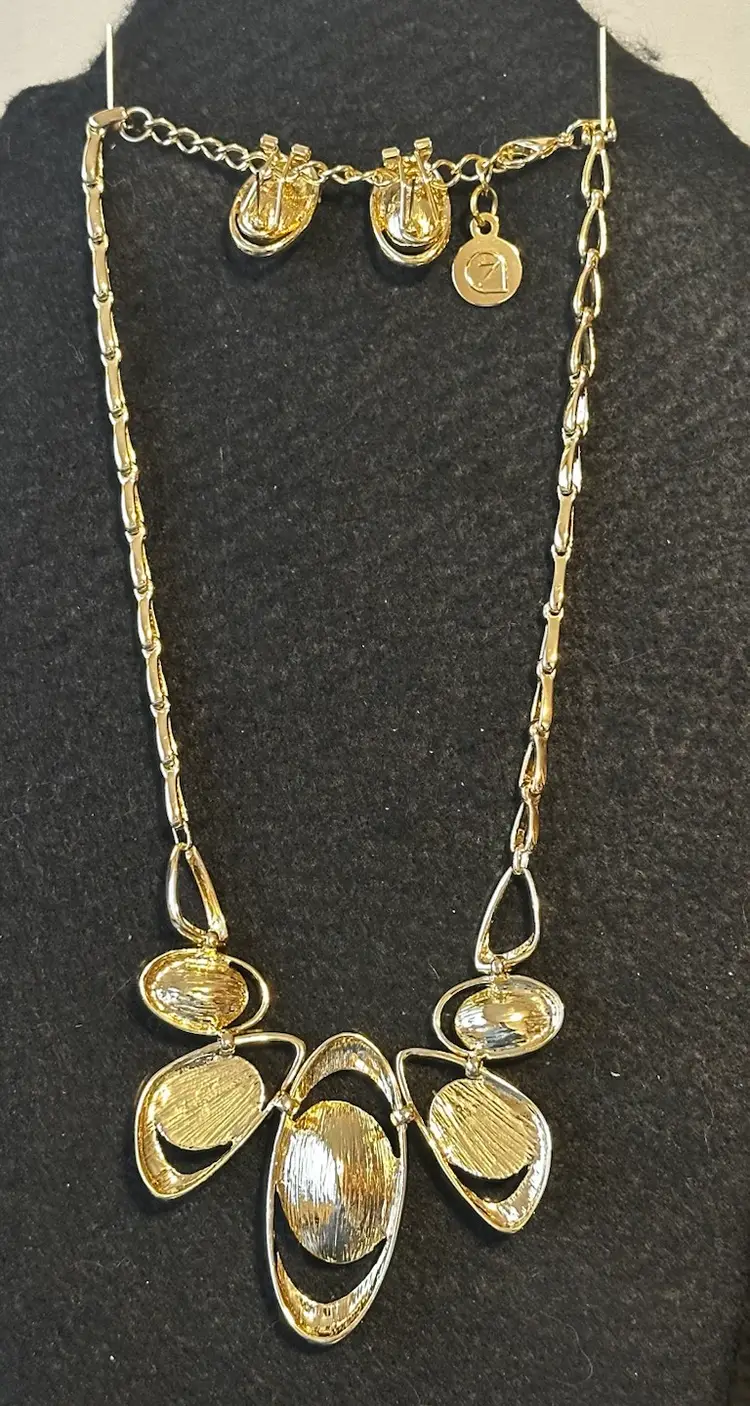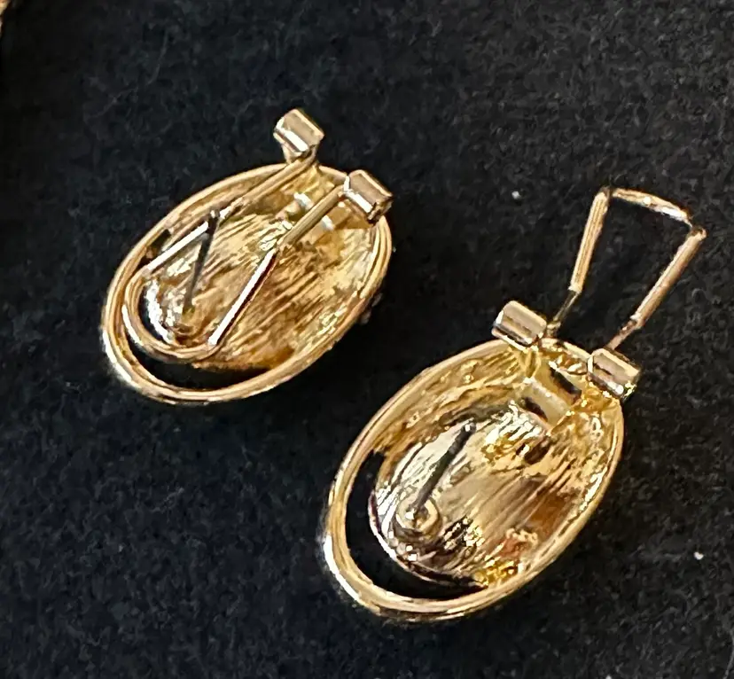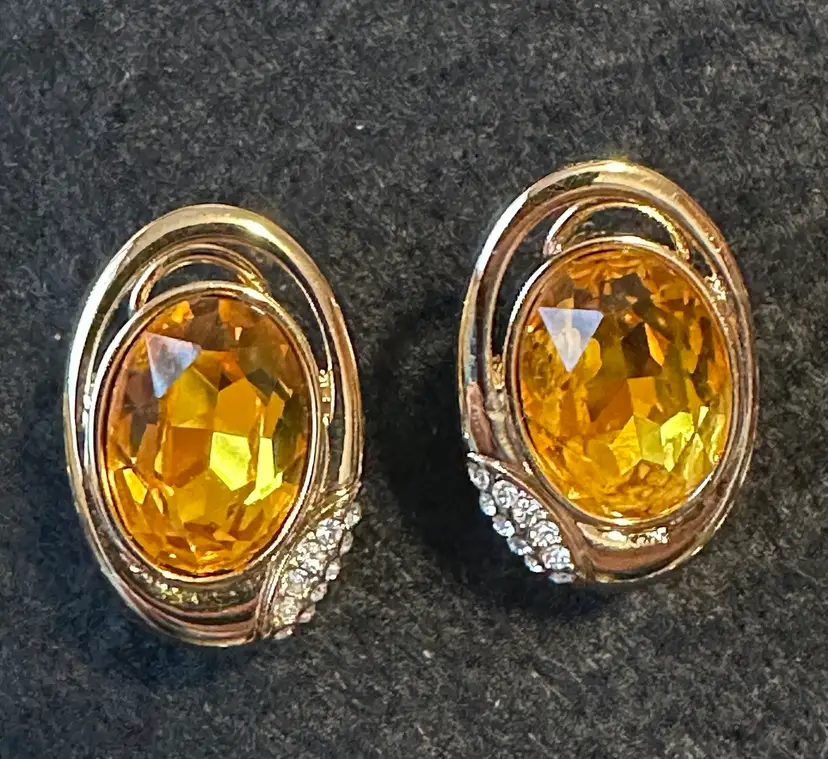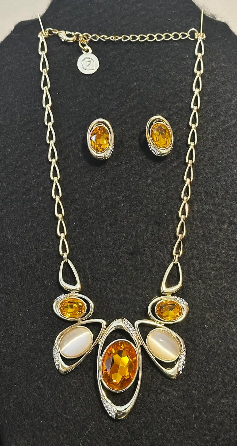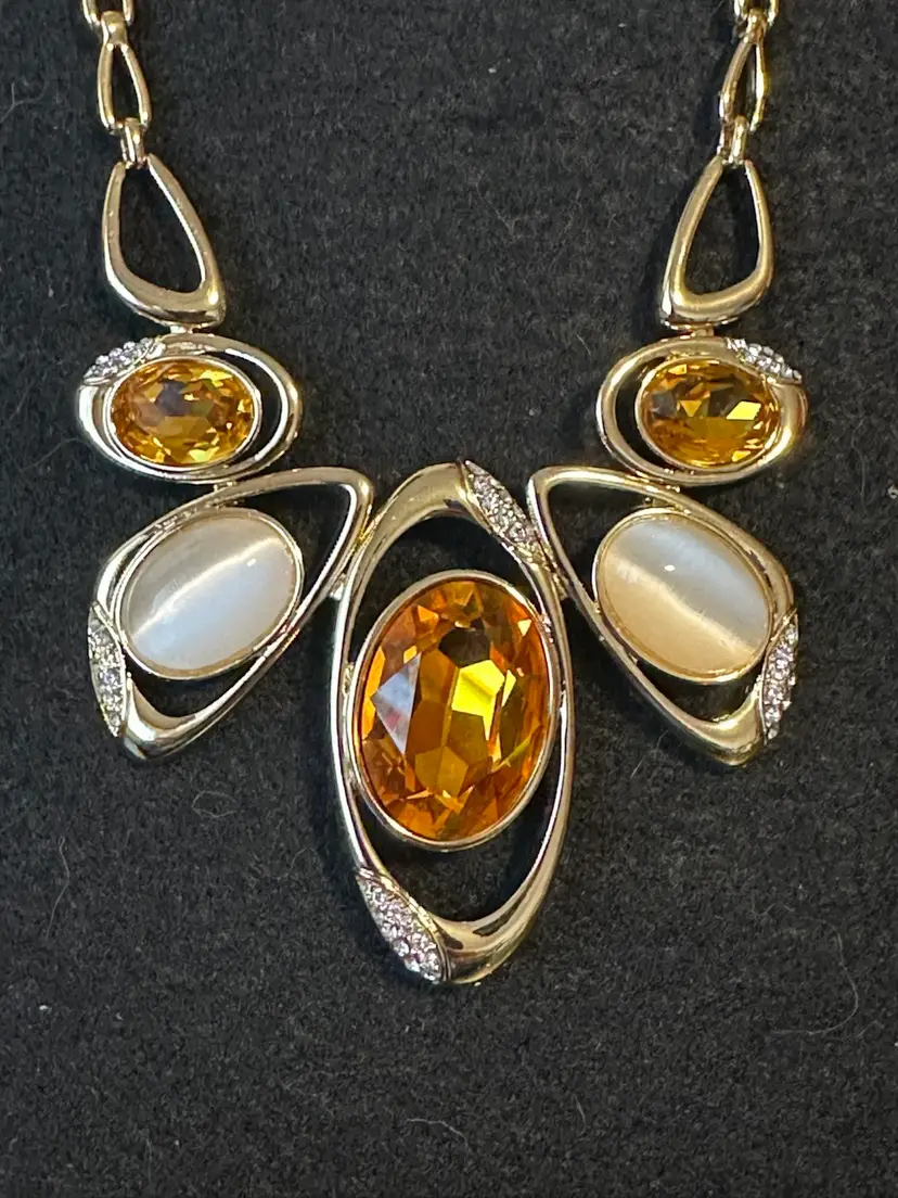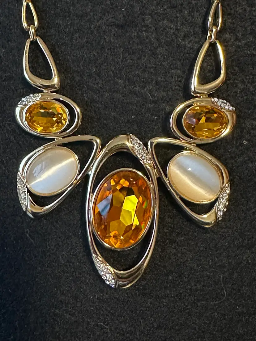 Stunning gold-tone Amber, Moonstone, & Rhinestone necklace. Necklace is 16” with a 3” extender. Center piece in pendant part is 2” earring are just under 1” and have a post back with clip enclosure.