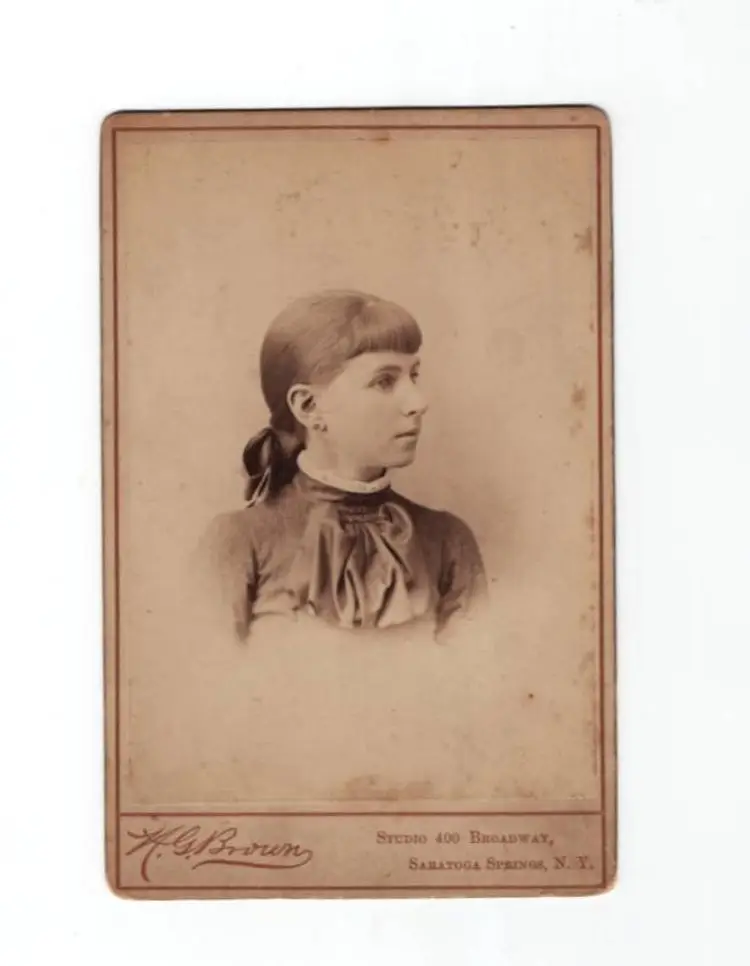 This charming Victorian cabinet card has portrait of young girl. On bottom is HG Brown Studio 400 Boadway Saratoga Springs NY. He was an active studio photographer around the 1890s, giving an approx. date for this picture.