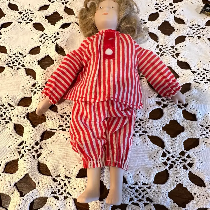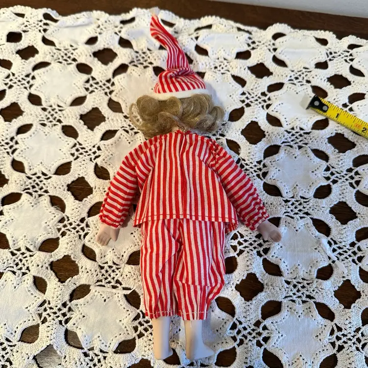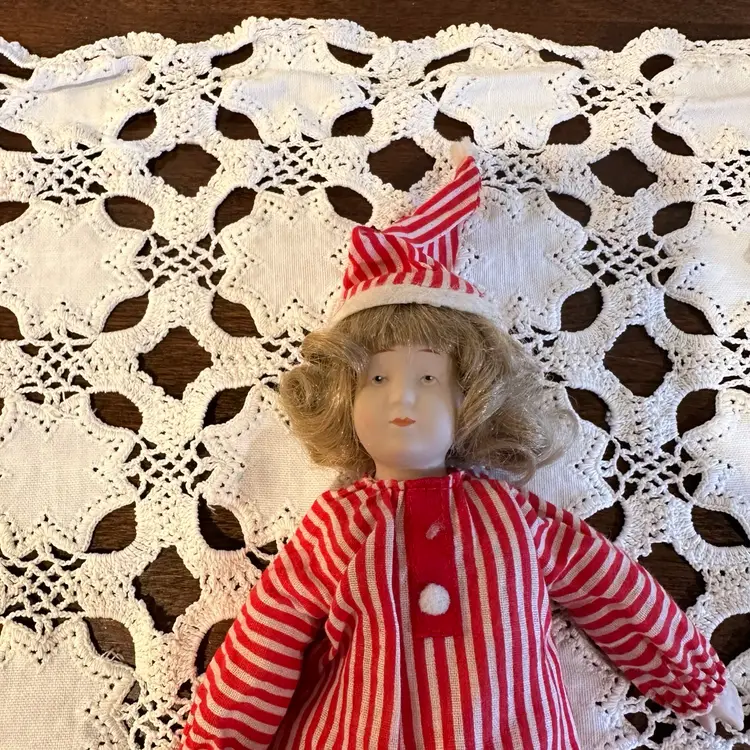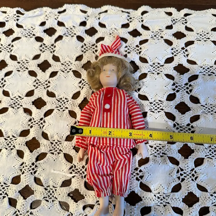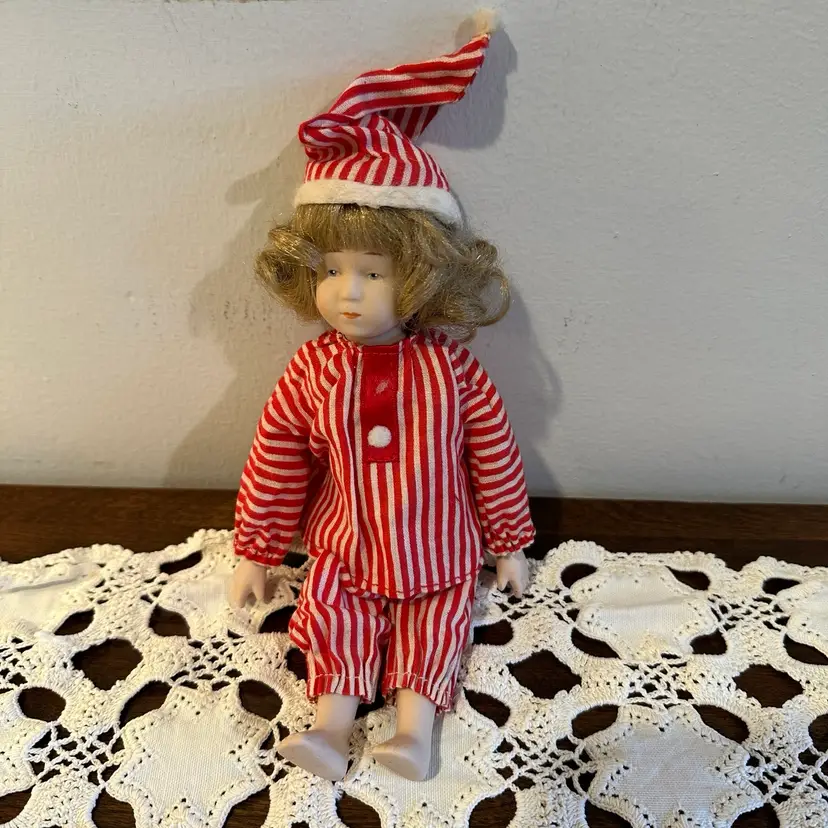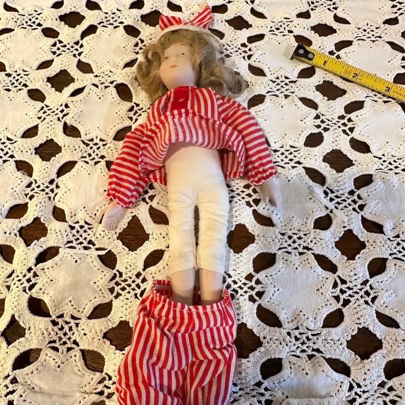 Charming vintage bisque doll dressed in red-and-white striped pajamas and a matching nightcap — a lovely collectible for doll enthusiasts and a whimsical piece of holiday decor. This doll has a delicately painted bisque head, arms, and legs, with a soft fabric body.