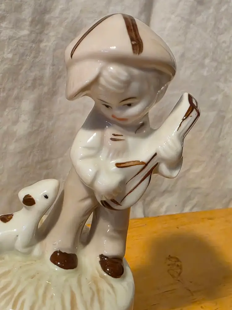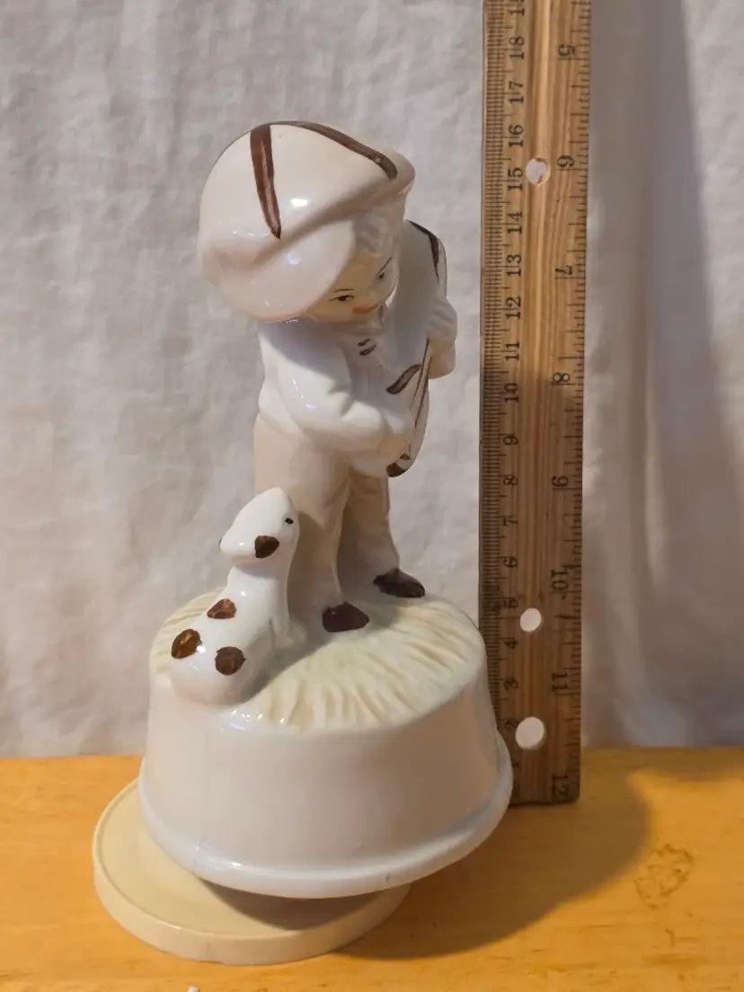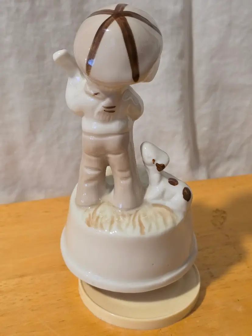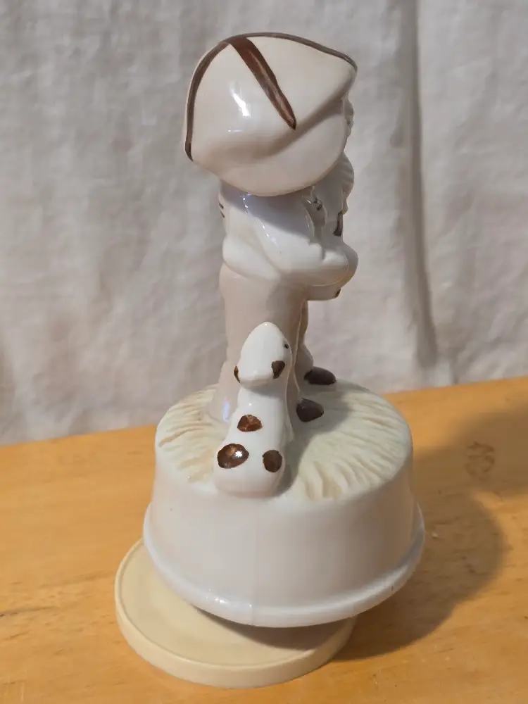 Add a touch of nostalgia to your decor with this delightful vintage figurine featuring a boy playing a guitar with his loyal dog by his side. Perfect for collectors or as a whimsical accent piece. Spins and plays music, no chips, cracks, or scratches