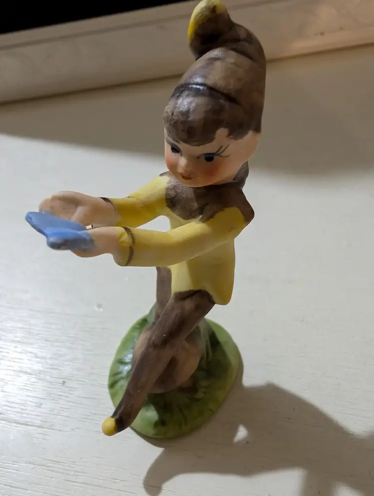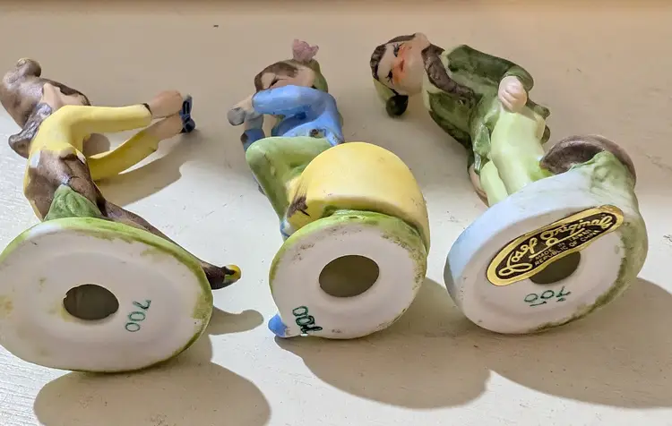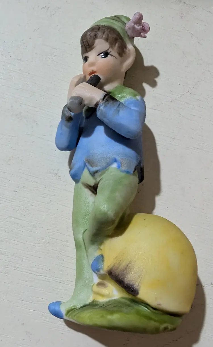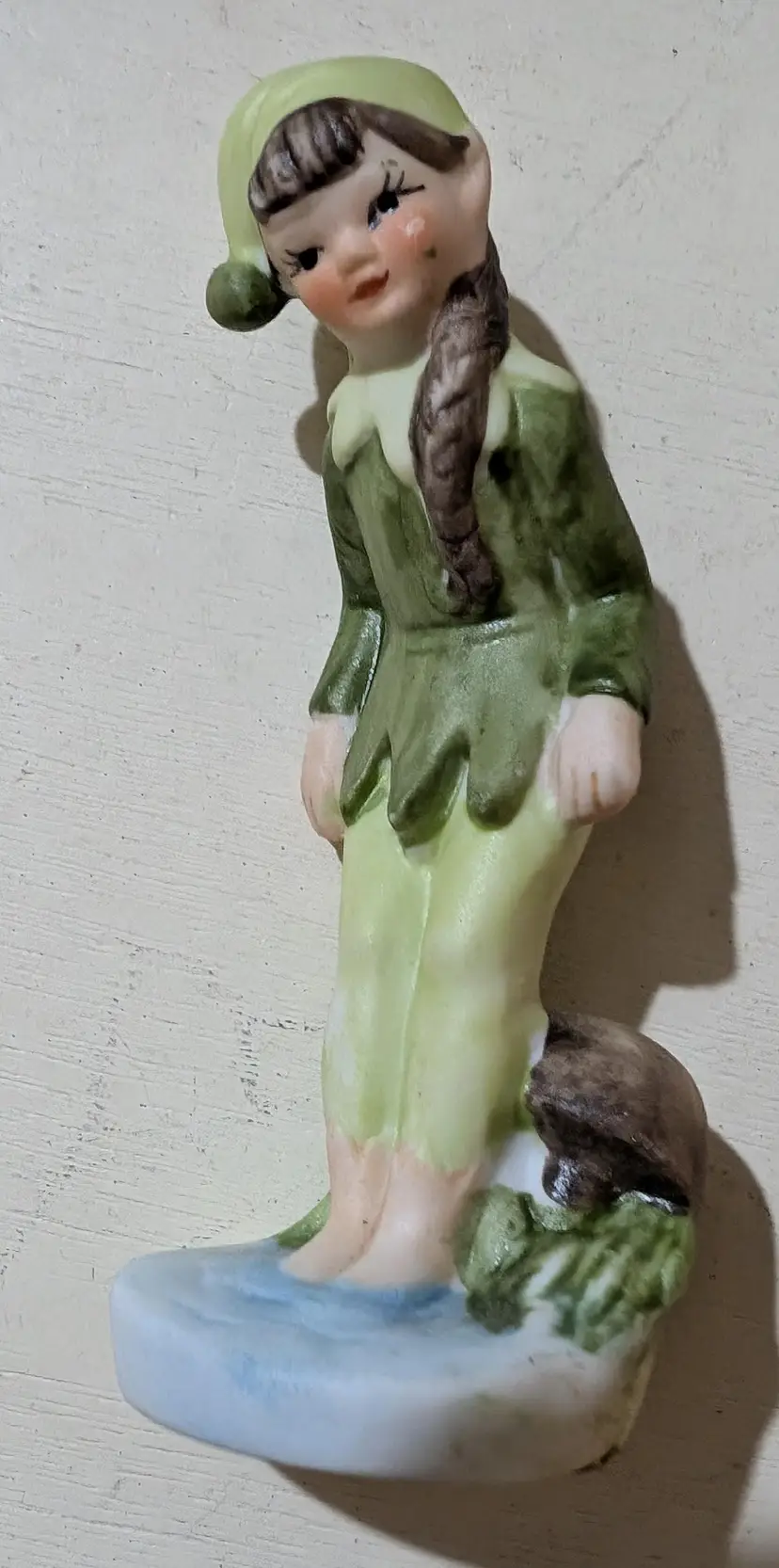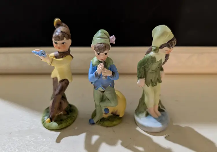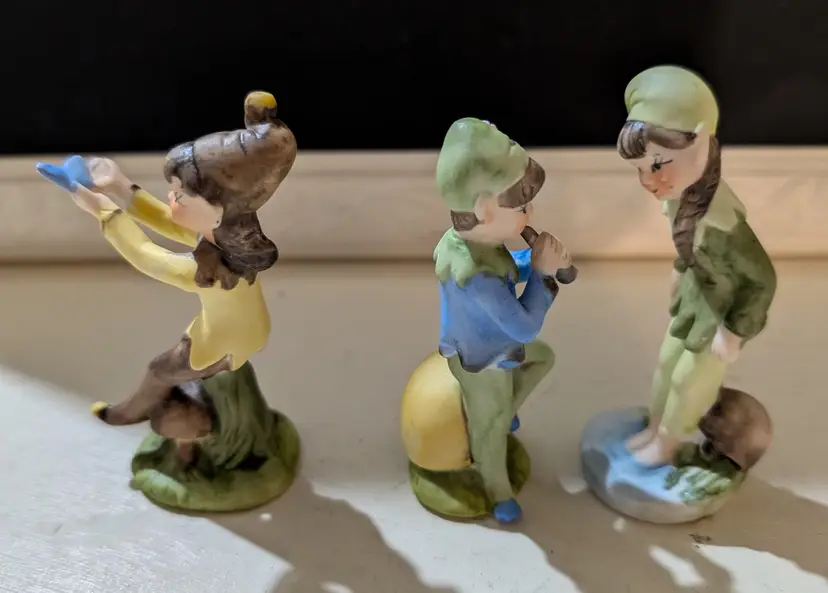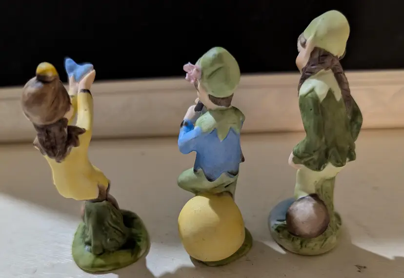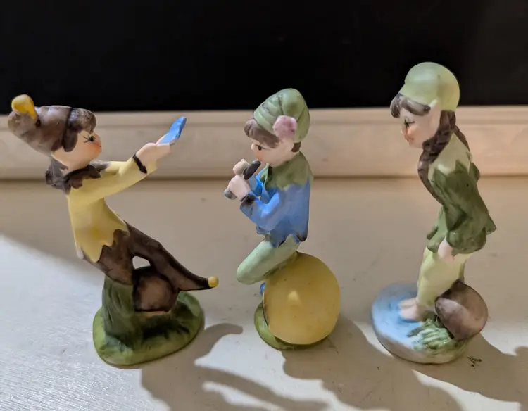 Adorable set of three vintage Joseph Original pixie figurines, each with unique poses and colorful outfits. These charming pieces are perfect for adding a whimsical touch to your home decor or as a delightful addition to your collection. In great condition with no visible chips or cracks.