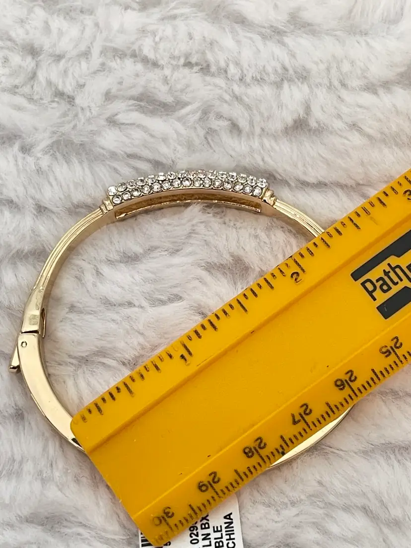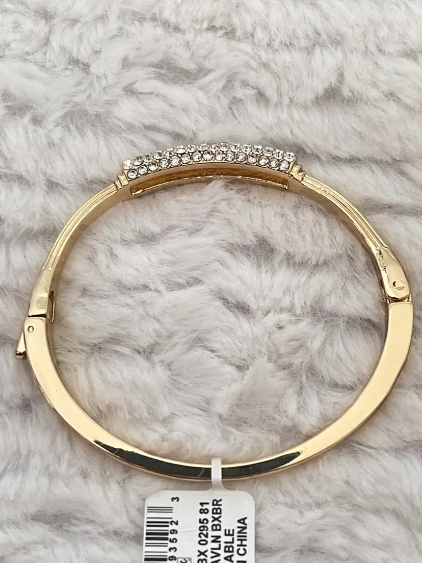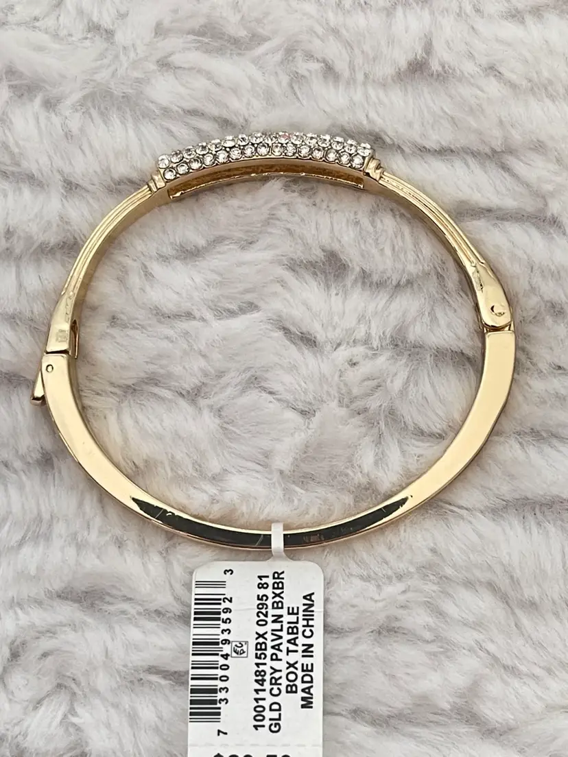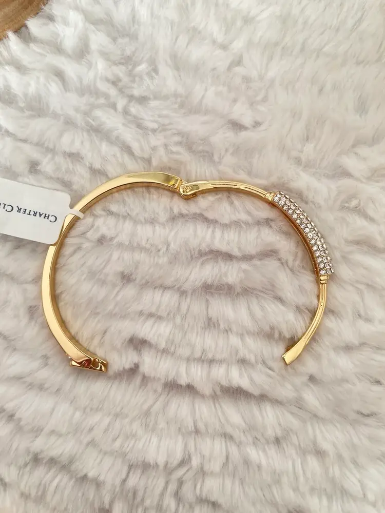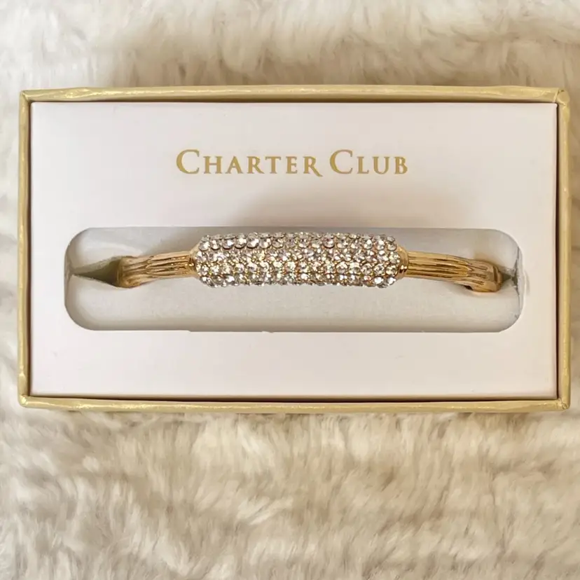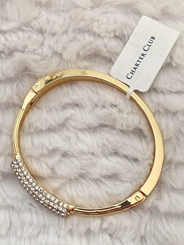 Charter Club NWT gold-tone hinged bangle bracelet featuring a pavé crystal centerpiece that adds just the right amount of sparkle. Pavé-set clear crystals Hinged bangle with secure closure Approximately 6 3/4”