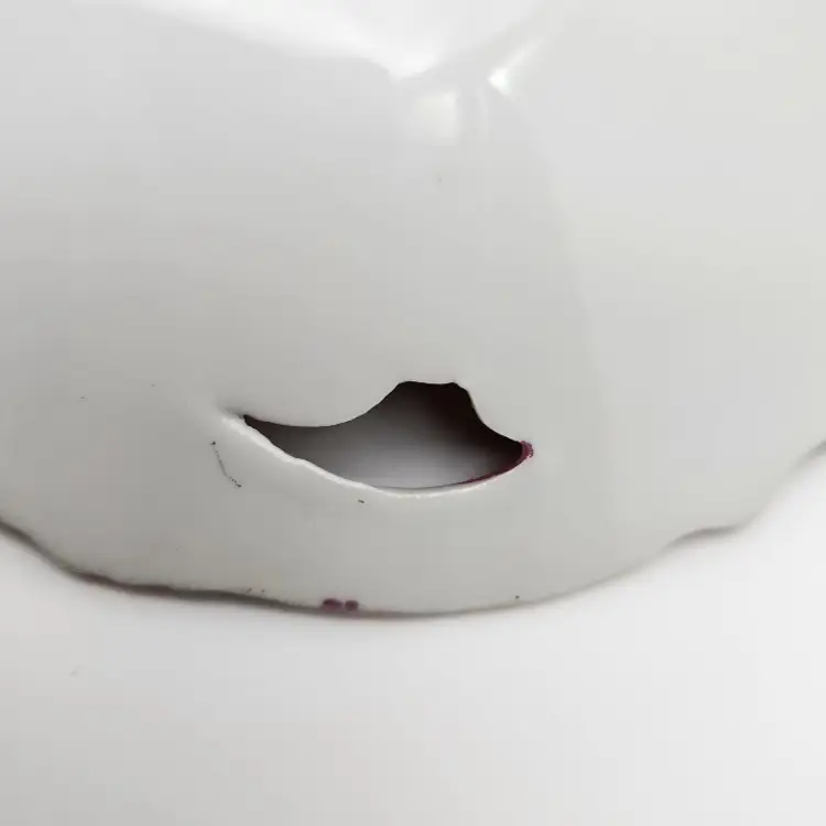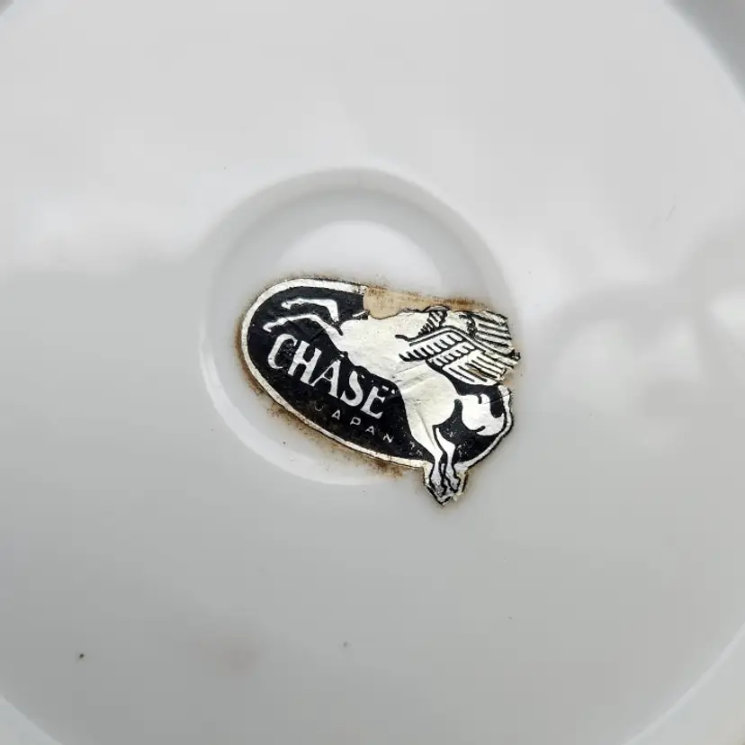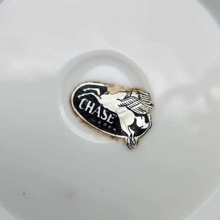 Please see the photos for its characteristics. There are no chips or cracks. The label is attached on the back. The back does show some paint which can be seen on the last photo.